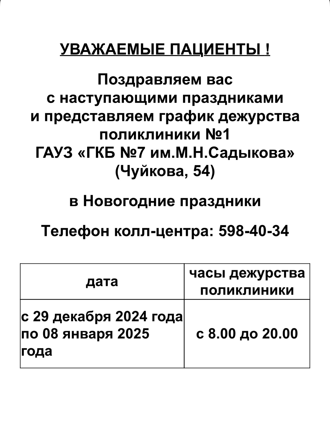 Часы дежурства поликлиники №1 и поликлиники №2 ГАУЗ ГКБ№7 им. М.Н. Садыкова г. Казани в новогодние праздники!