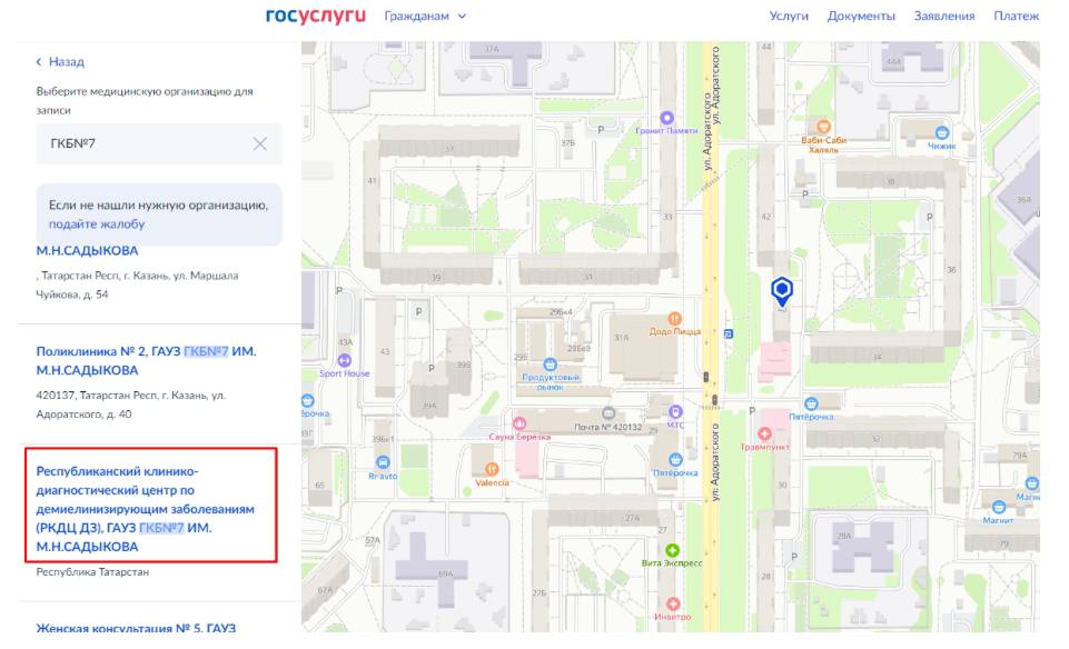 Для записи на прием к специалисту РКДЦ ДЗ через личный кабинет на ЕПГУ необходимо выбрать подразделение Республиканский клинико-диагностический центр по демиелинизирующим заболеваниям.