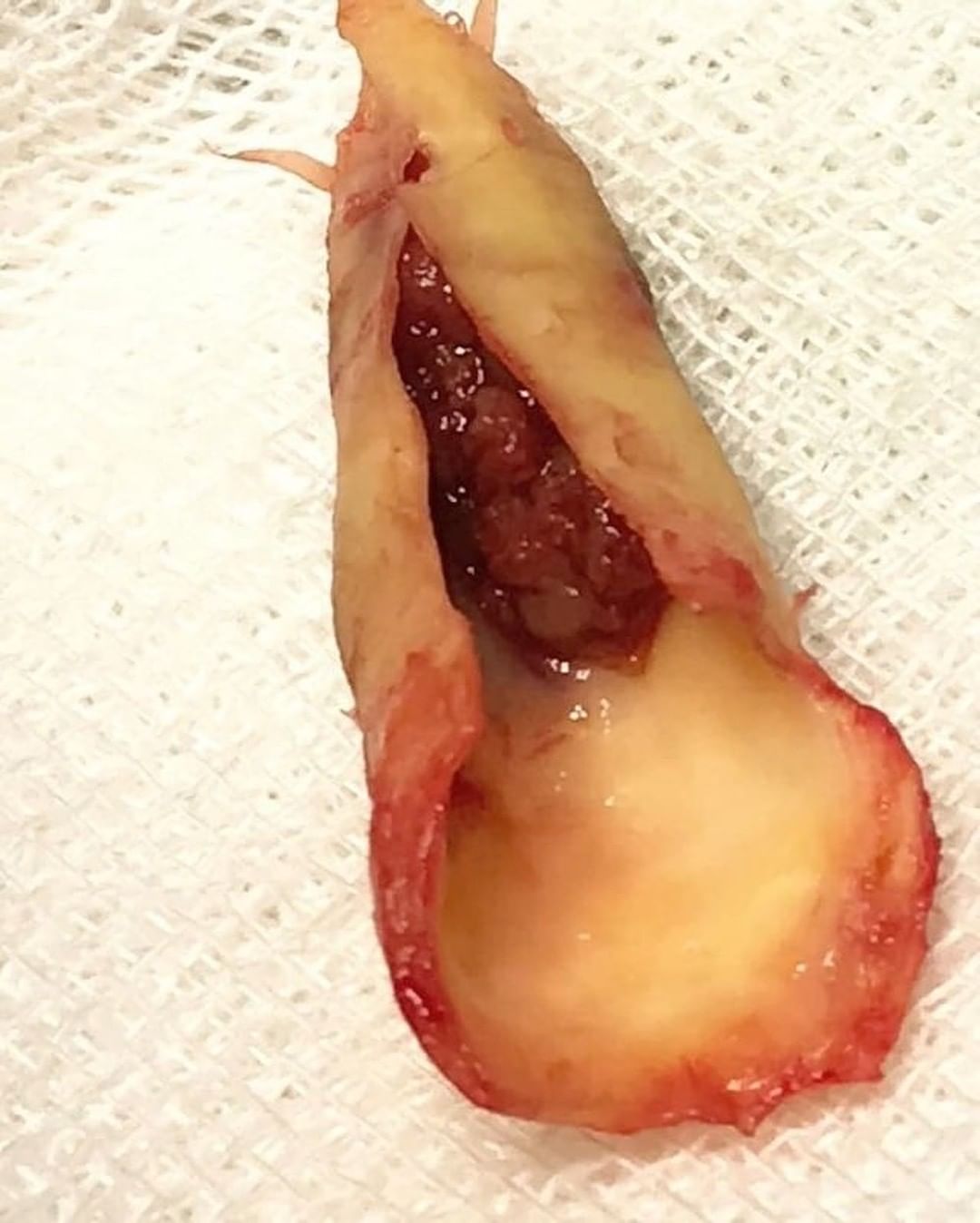 Это так называемая бляшка из внутренней сонной артерии. Ее только что извлекли у 73-летнего пациента.