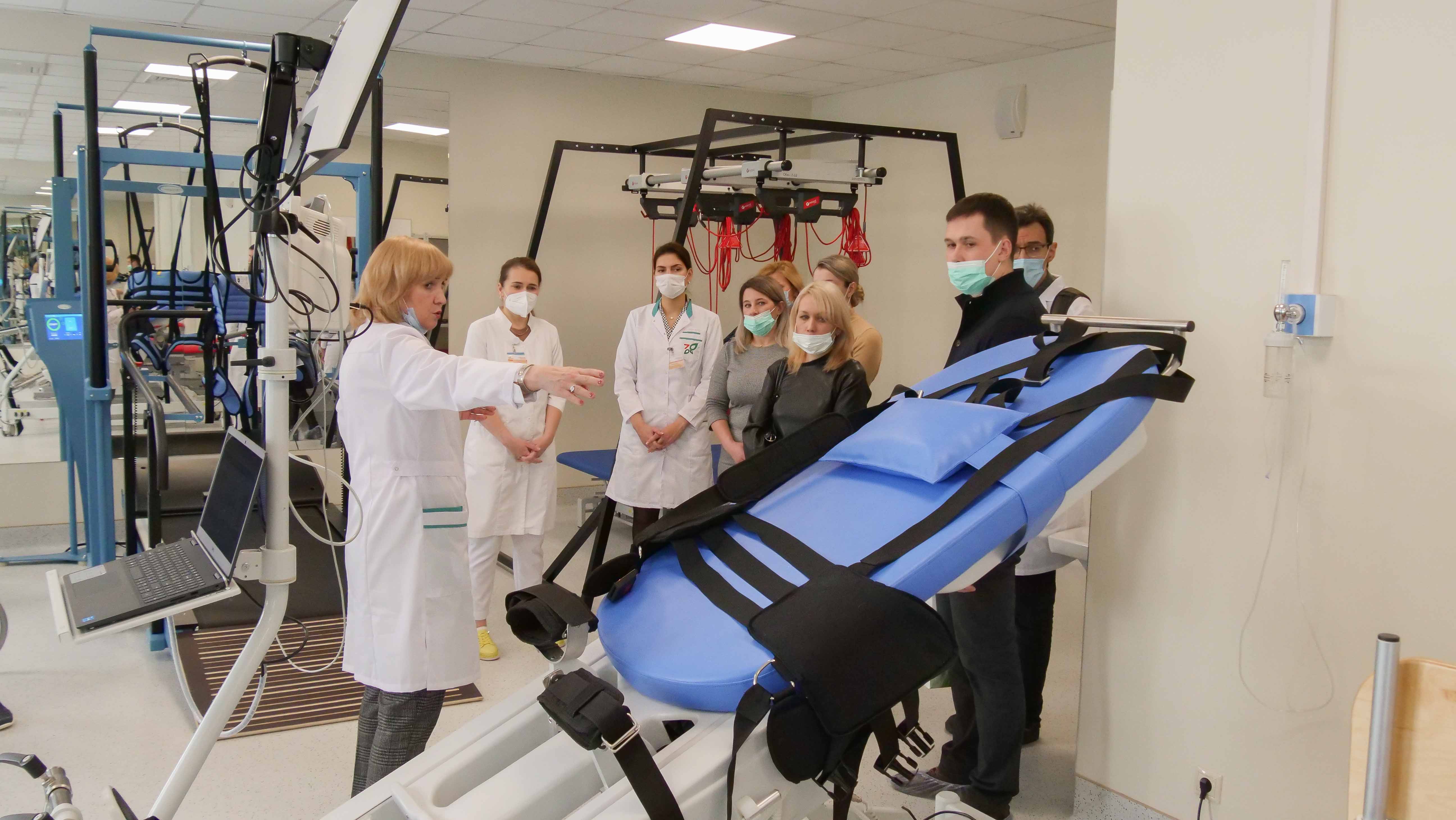 Количество высокотехнологичного оборудования и для самостоятельных занятий пациентов с различными заболеваниями впечатлило башкирских коллег: умные тренажеры для людей с различными проблемами здоровья, аппараты, позволяющие восстановить обездвиженные части тела, релакс-комнаты, тренажерные залы, в которых есть даже стенка для скалолазания.