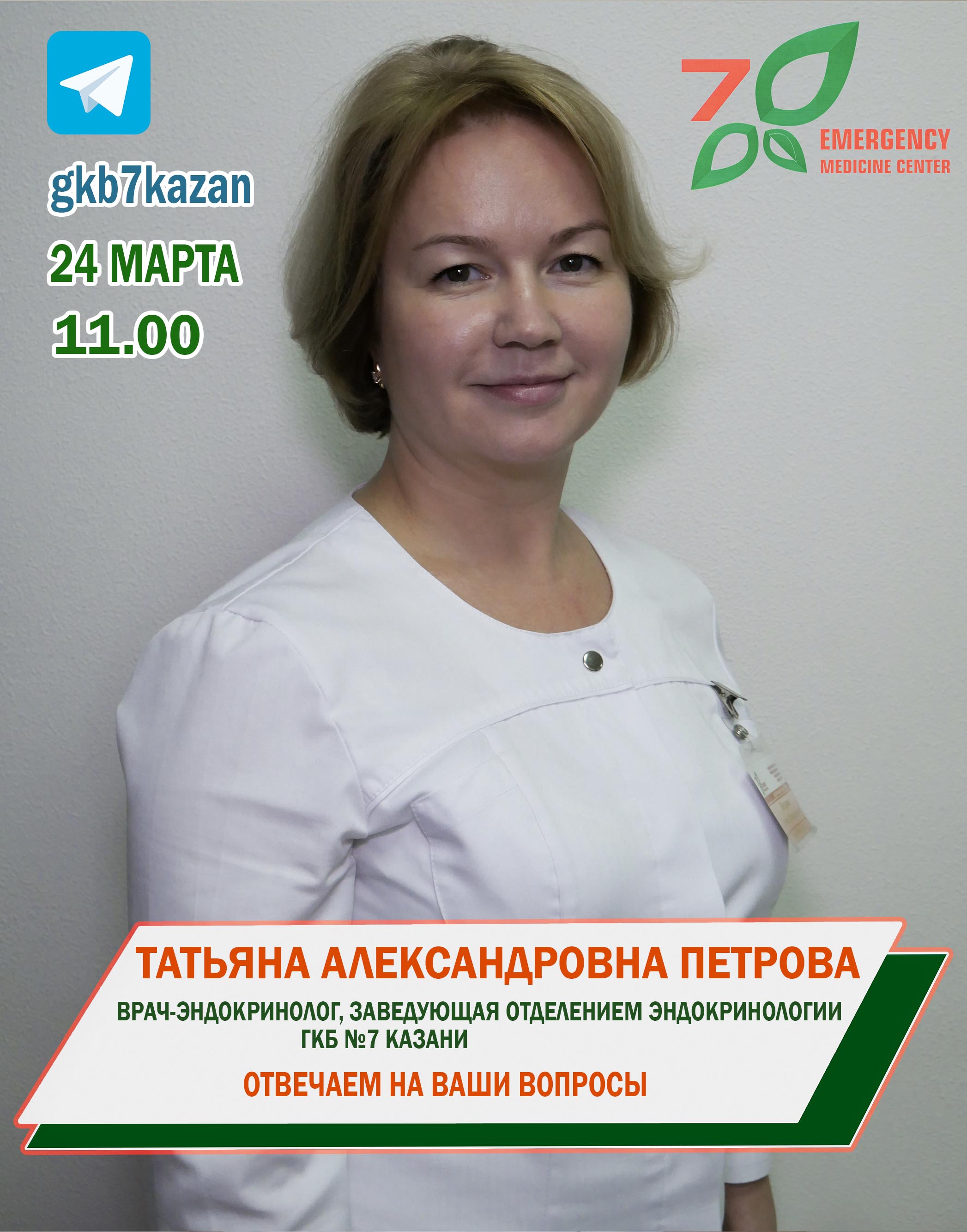 На эти и другие вопросы ответит врач – эндокринолог, заведующая эндокринологическим отделением Городской клинической больницы №7 Казани Татьяна Александровна Петрова 24 марта в 11.00. на Телеграм – площадке https://t.me/gkb7kazan
