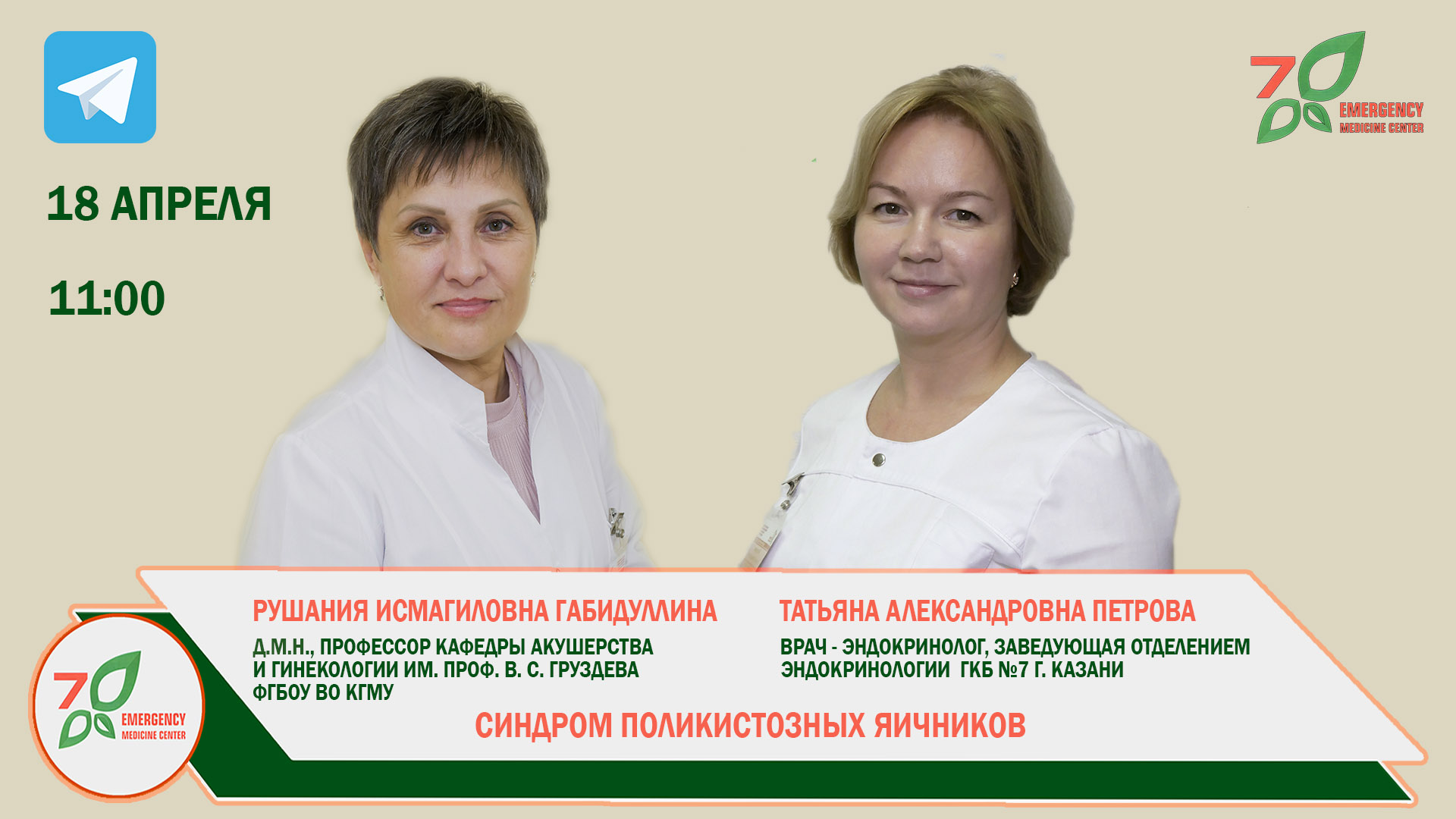 Разобраться с синдромом поликистозных яичников помогут ведущие врачи Городской клинической больницы №7 Казани - доктор медицинских наук, профессор кафедры акушерства и гинекологии им. профессора В.С.Груздева КГМУ Рушания Исмагиловна Габидуллина и врач – эндокринолог, заведующая эндокринологическим отделением ГКБ 7 Казани Татьяна Александровна Петрова 18 апреля.