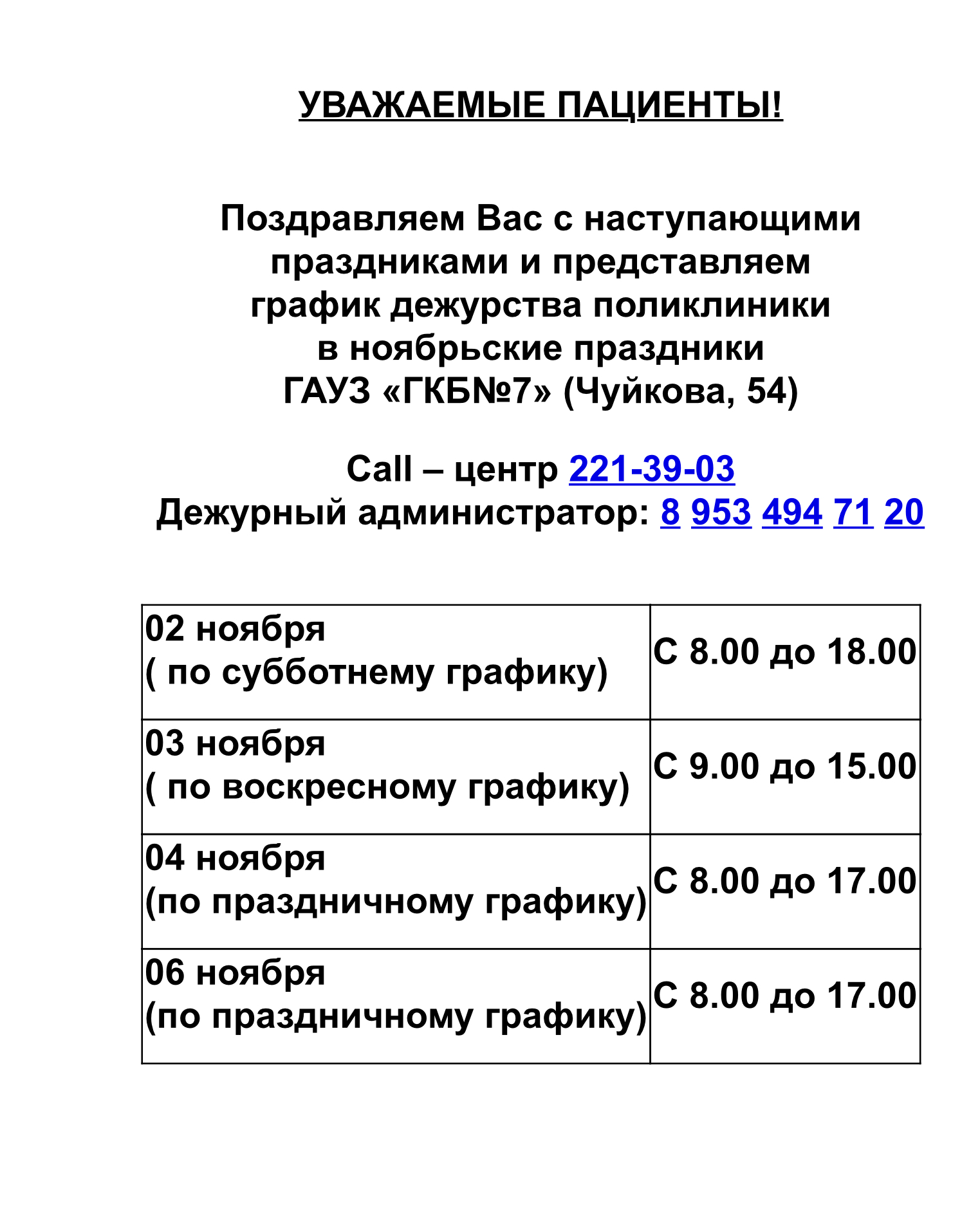 График работы поликлиники ГКБ № 7 в праздничные дни