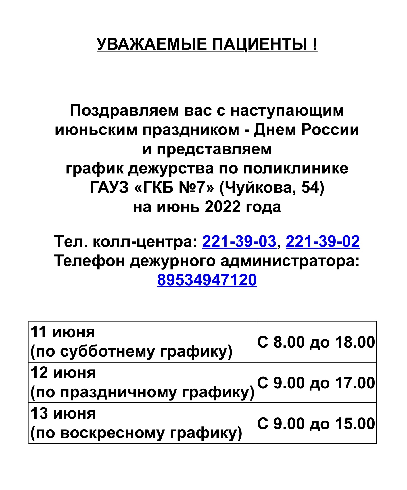 График работы поликлиники 11-13 июня