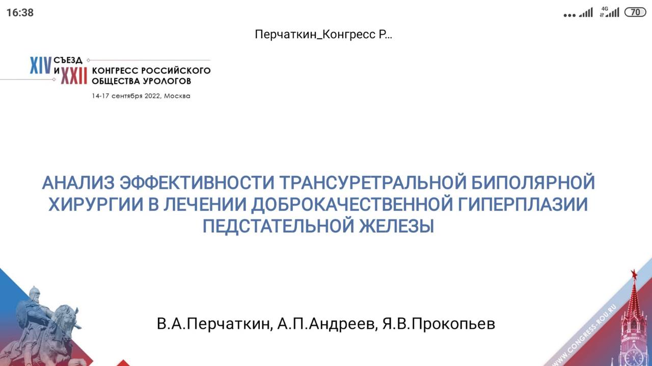 Руководитель Центра эндоурологии ГКБ 7 Казани Владимир Александрович Перчаткин представил коллегам совместный результат работы врачей -урологов нашей клиники «Анализ эффективности трансуретральной биполярной хирургии в лечении доброкачественной гиперплазии предстательной железы».