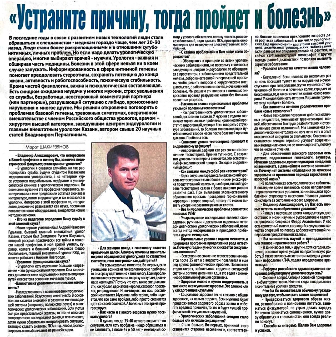 Откровенный разговор о проблемах базовой гигиены, тревожных симптомах, оперативном вмешательстве с членом Российского общества урологов, врачом – хирургом высшей категории, заведующим Центра эндоурологии ГКБ 7 Казани и главным внештатным урологом Казани, автором свыше 20 научных статей Владимиром Александровичем Перчаткиным