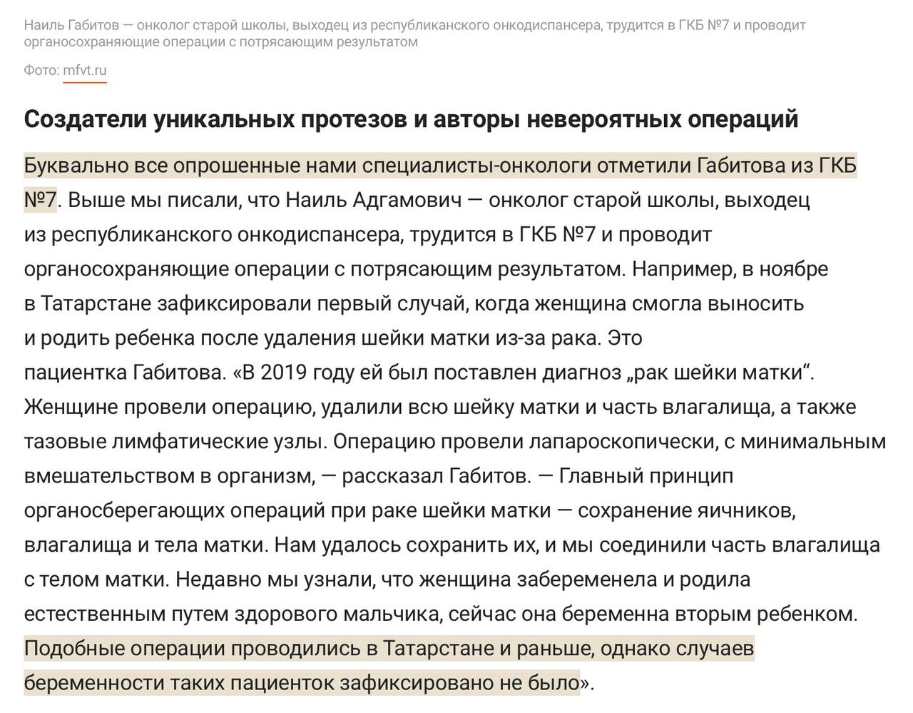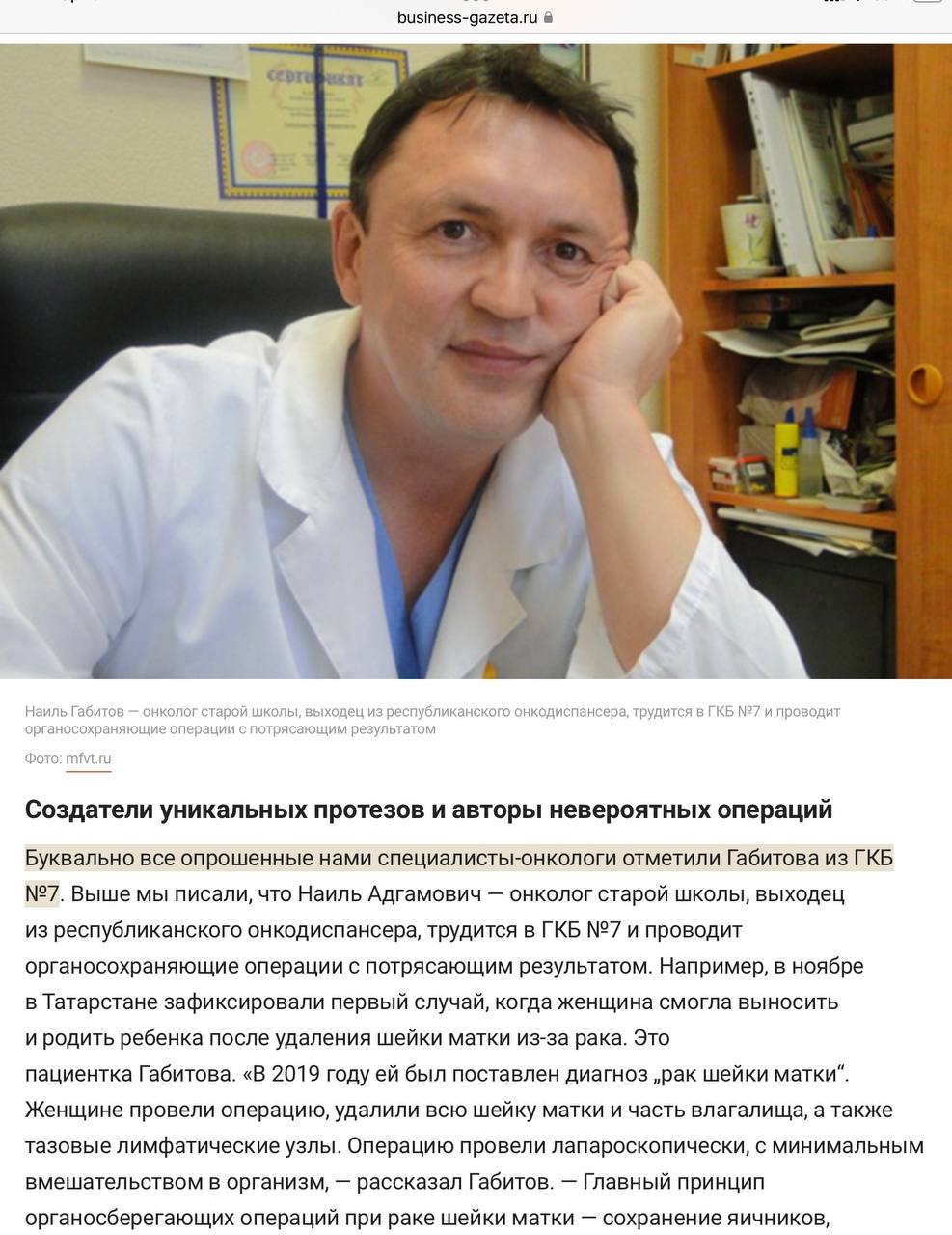 Буквально все опрошенные нами специалисты-онкологи отметили Габитова из ГКБ №7. Ранее журналисты писали, что Наиль Адгамович — онколог старой школы, выходец из республиканского онкодиспансера, трудится в ГКБ №7 и проводит органосохраняющие операции с потрясающим результатом. Например, в ноябре в Татарстане зафиксировали первый случай, когда женщина смогла выносить и родить ребенка после удаления шейки матки из-за рака. Это пациентка Габитова. «В 2019 году ей был поставлен диагноз „рак шейки матки“. Женщине провели операцию, удалили всю шейку матки и часть влагалища, а также тазовые лимфатические узлы. Операцию провели лапароскопически, с минимальным вмешательством в организм, — рассказал Габитов. — Главный принцип органосберегающих операций при раке шейки матки — сохранение яичников, влагалища и тела матки. Нам удалось сохранить их, и мы соединили часть влагалища с телом матки. Недавно мы узнали, что женщина забеременела и родила естественным путем здорового мальчика, сейчас она беременна вторым ребенком. Подобные операции проводились в Татарстане и раньше, однако случаев беременности таких пациенток зафиксировано не было».