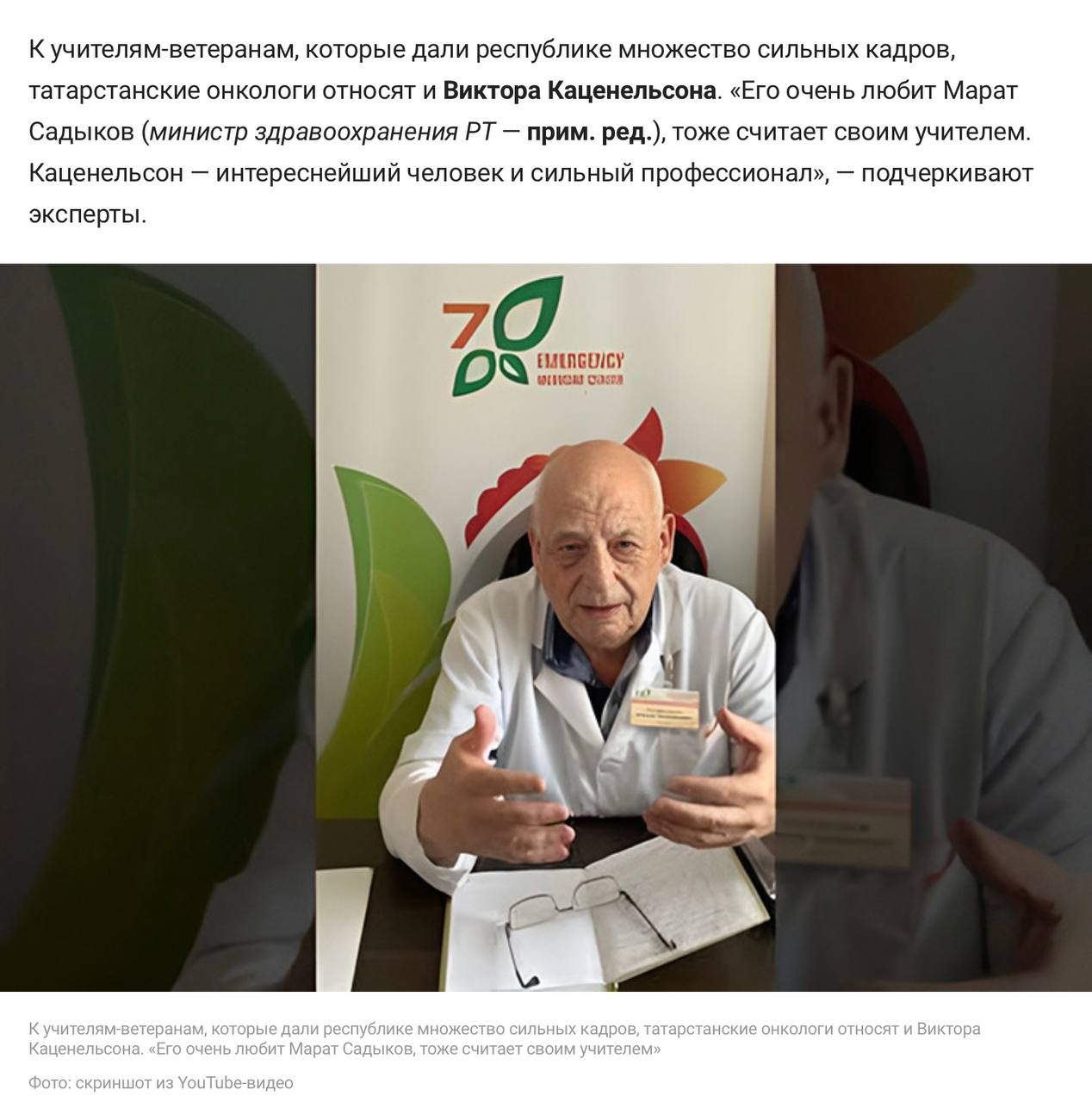 К учителям-ветеранам, которые дали республике множество сильных кадров, татарстанские онкологи относят и Виктора Каценельсона. «Его очень любит Марат Садыков (министр здравоохранения РТ — прим. ред.), тоже считает своим учителем. Каценельсон — интереснейший человек и сильный профессионал», — подчеркивают эксперты.