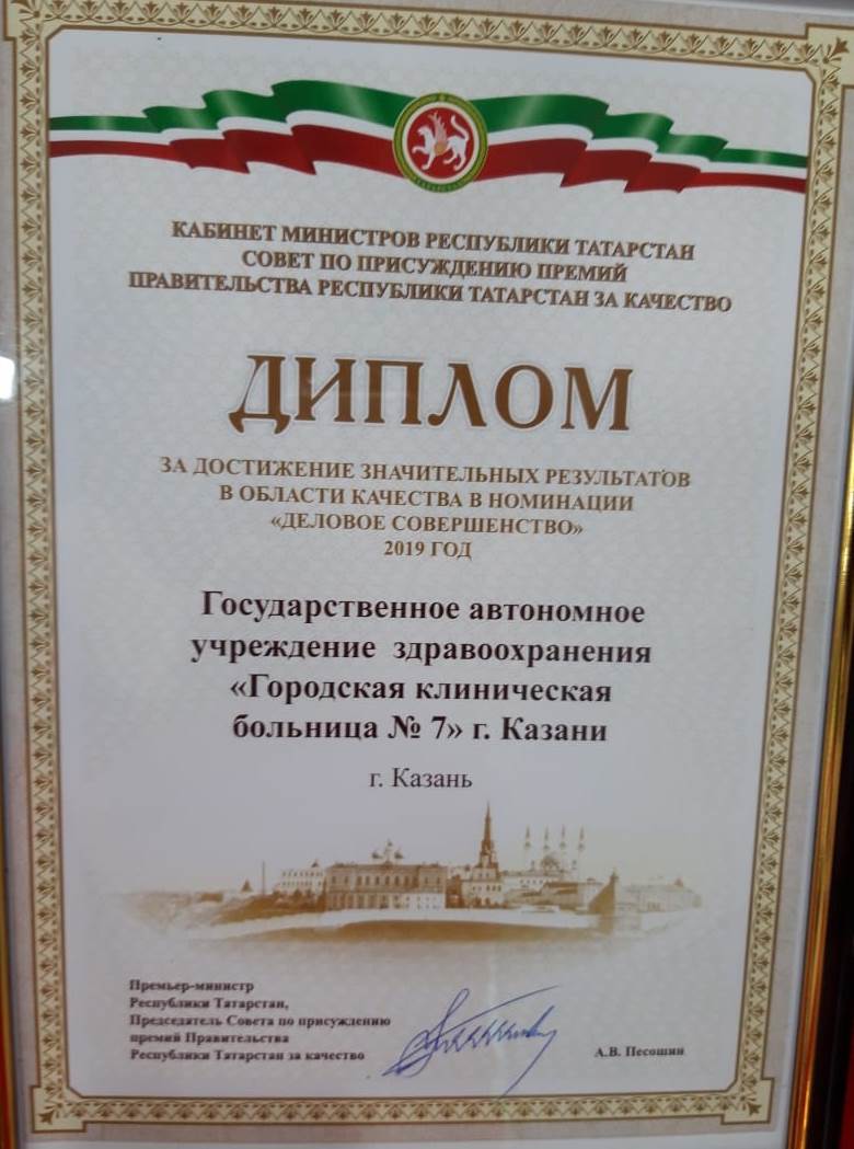 ГКБ № 7 Казани - дипломант республиканского конкурса на соискание премии правительства РТ за качество 2019 года