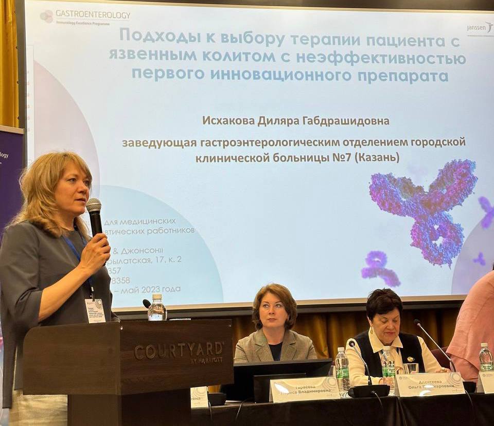 Врач-гастроэнтеролог, заведующая гастроэнтерологического отделения ГКБ 7 Казани Диляра Габдрашитовна Исхакова представила опыт своей работы - подходы к выбору терапии пациента с язвенным колитом с неэффективностью первого инновационного препарата.