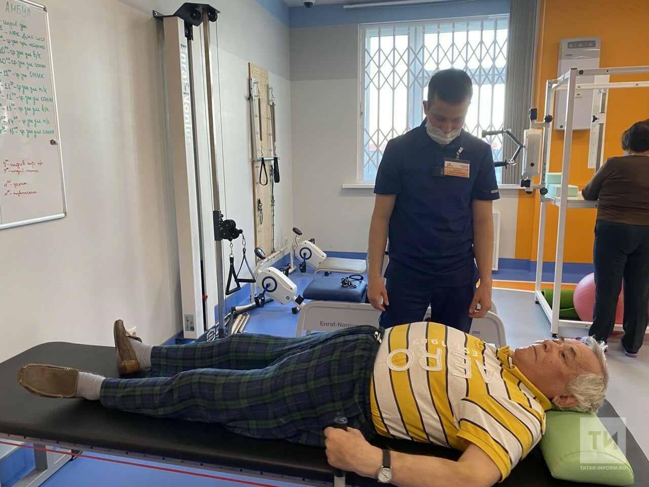 На тренажере занимается 73-летний Рифат Сафин. Мужчина перенес инсульт, сейчас восстанавливает подвижность правой части тела.