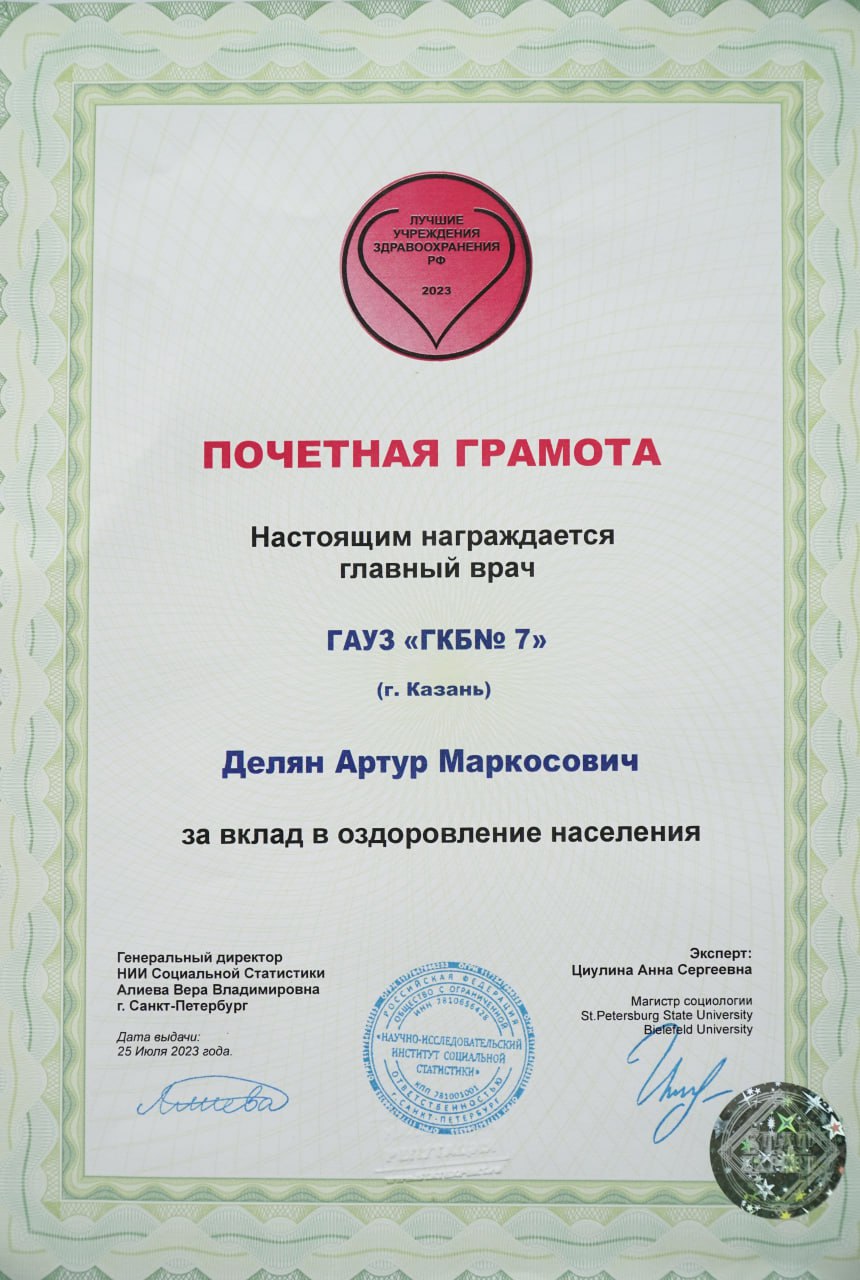 За вклад в оздоровление населения почетной грамоты удостоен Артур Маркосович Делян, главный врач ГАУЗ «ГКБ 7 им.М.Н.Садыкова».