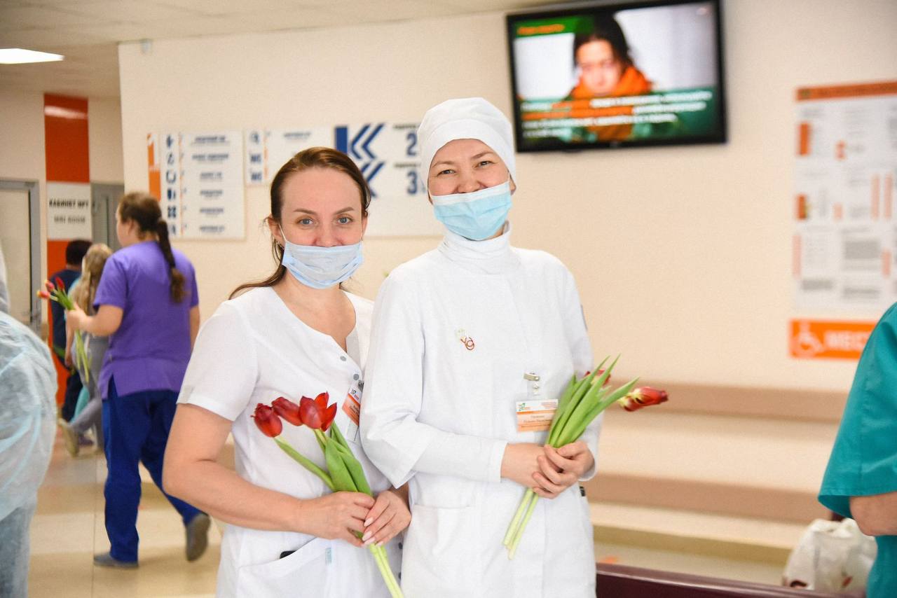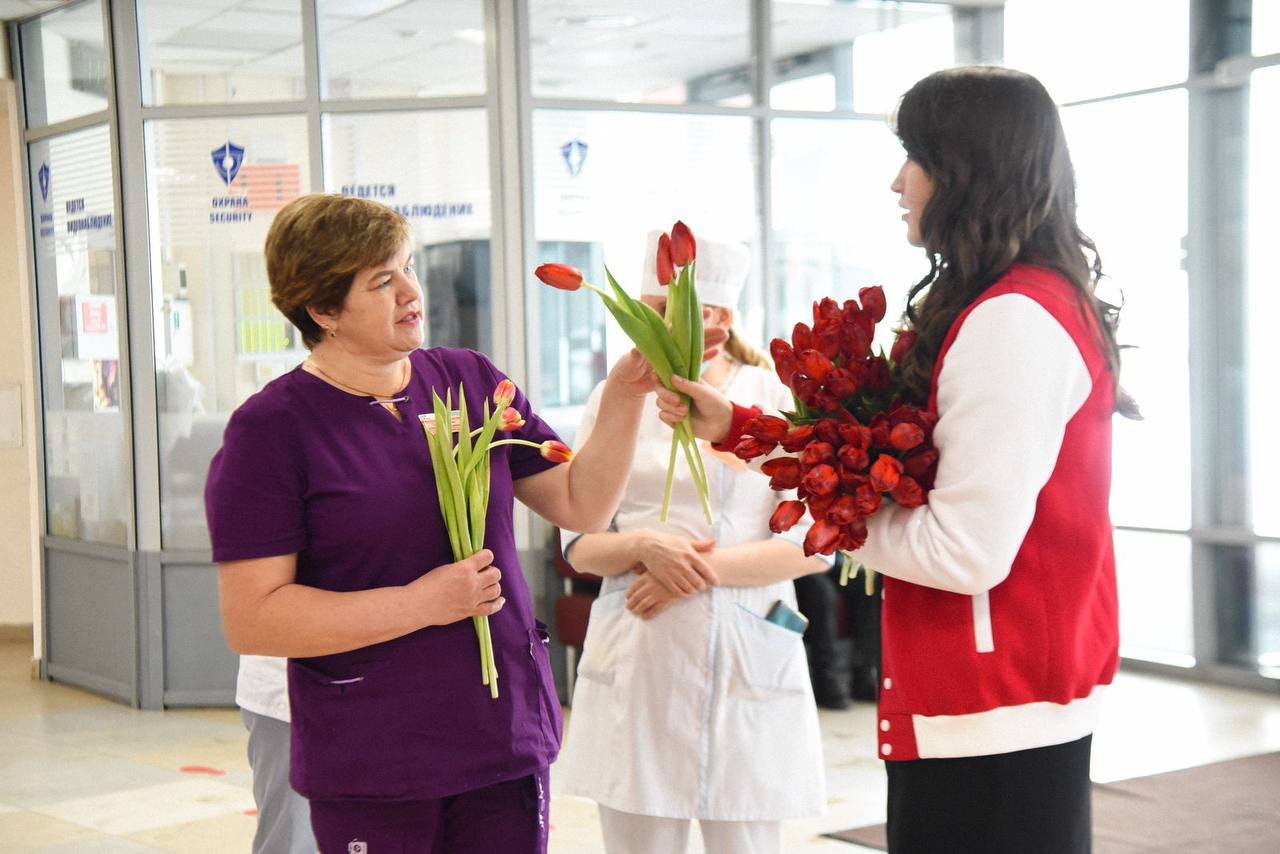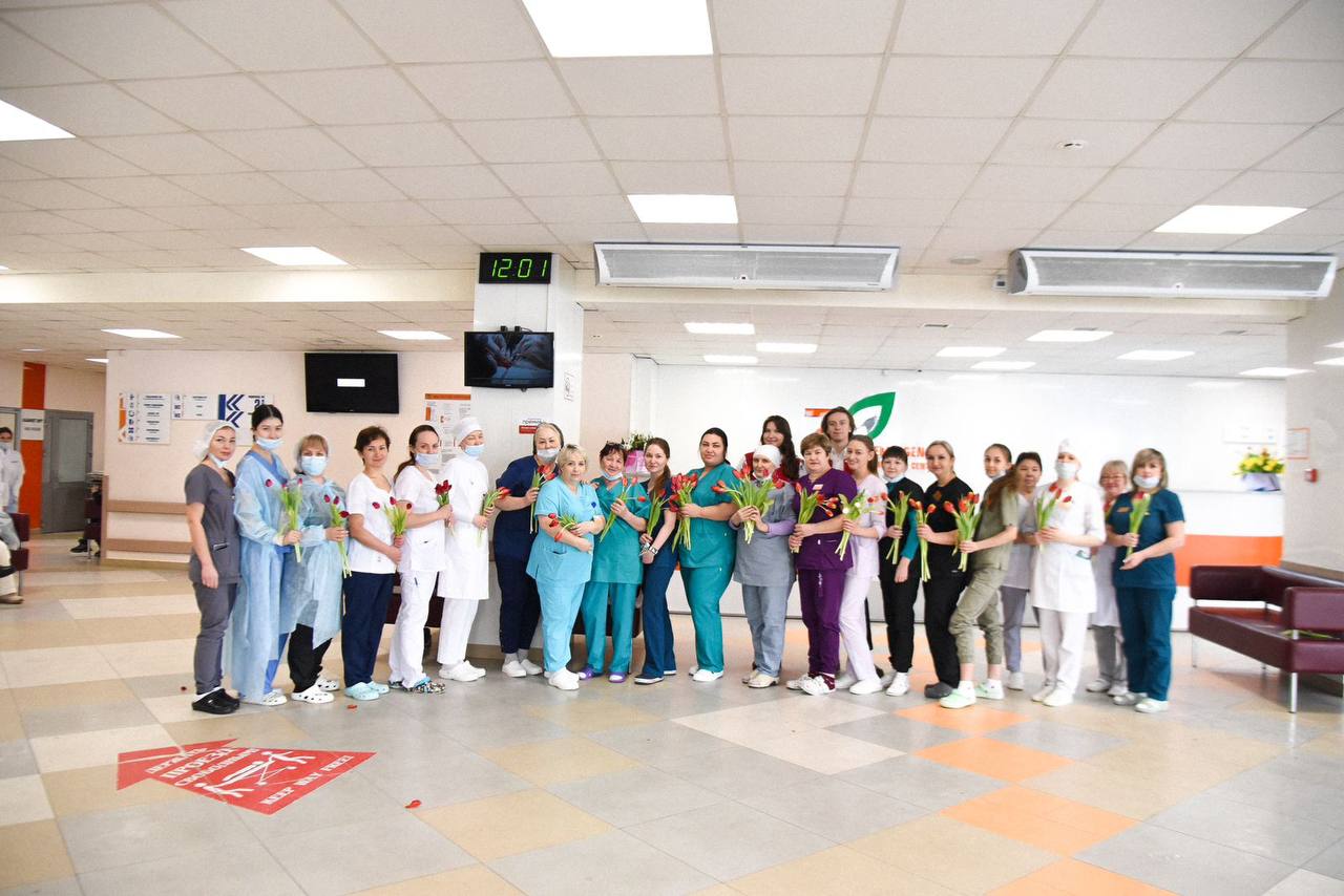 Волонтеры медики поздравили женский персонал клиники с 8 Марта