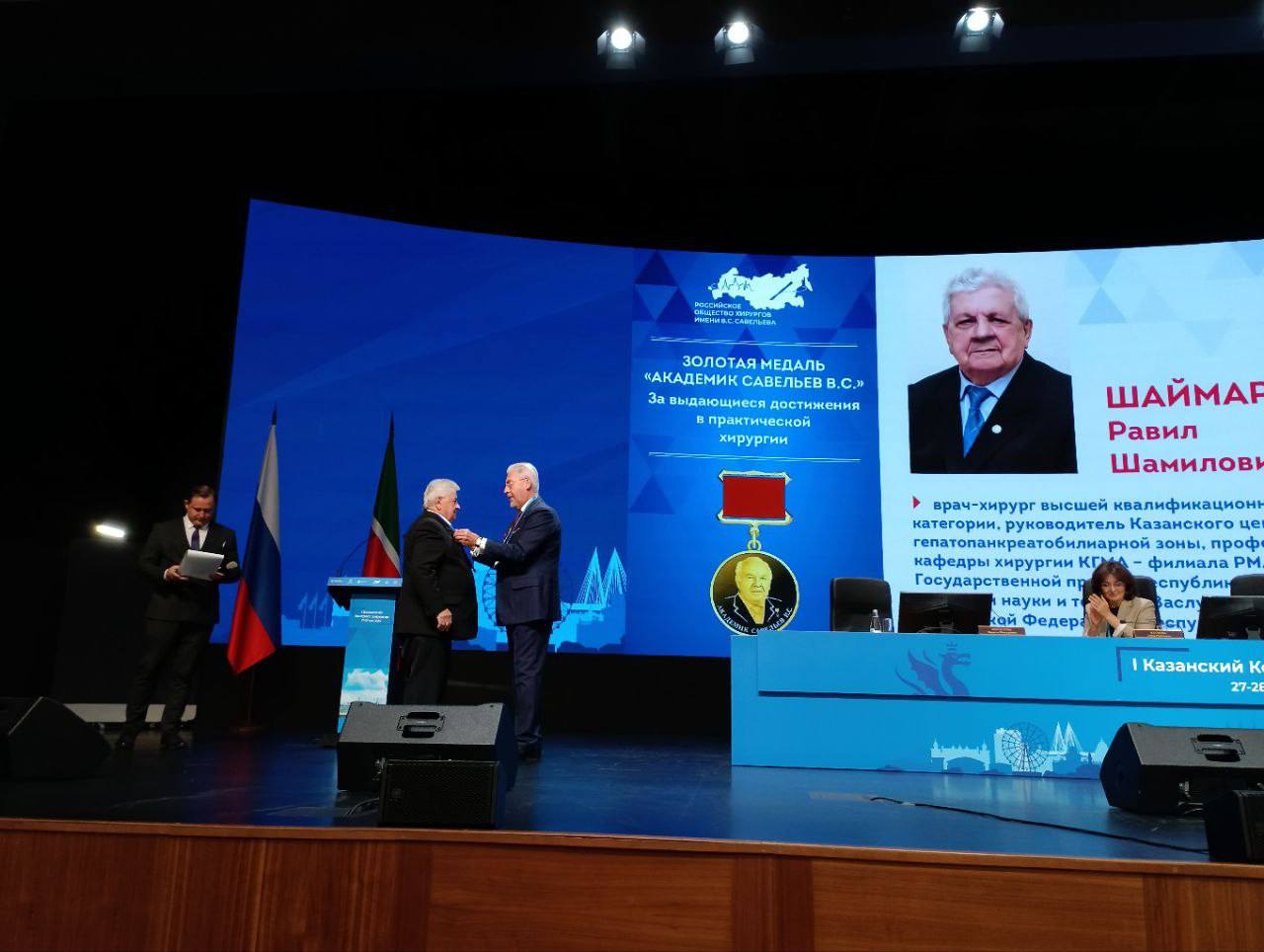 За выдающиеся достижения в практической хирургии золотой медалью «Академика Савельева В.С.» награжден научный куратор абдоминальных хирургов ГКБ 7 им.М.Н.Садыкова - врач-хирург высшей квалификационной категории, руководитель городского центра хирургии гепатопанкреатобилиарной зоны, заслуженный врач РФ и РТ, профессор кафедры хирургии КГМА, Равил Шамилович Шаймарданов.