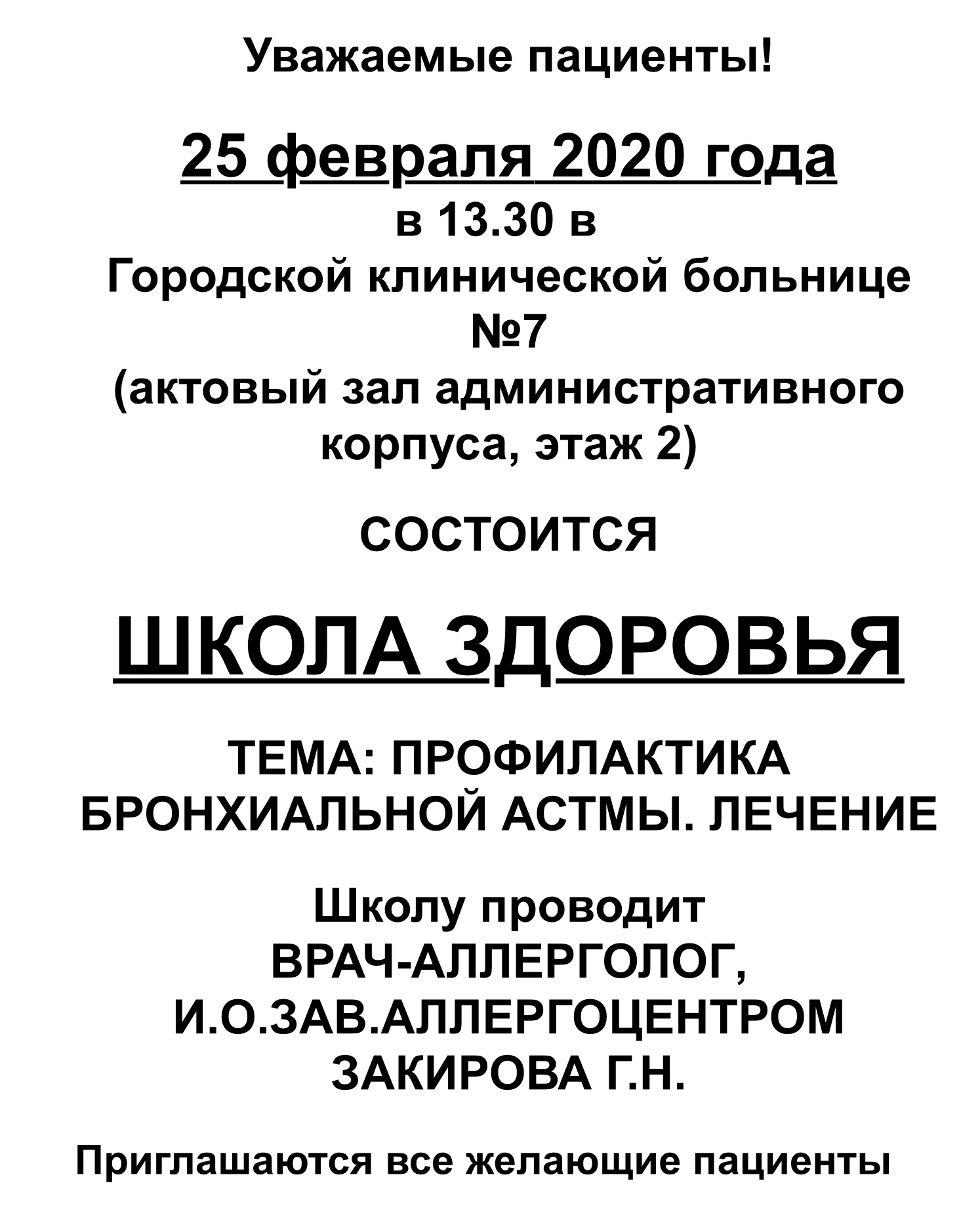 25 февраля 2020 года в 13.30 в Городской клинической больнице №7 Казани (актовый зал административного корпуса, этаж 2) состоится очередной урок ШКОЛЫ ЗДОРОВЬЯ.