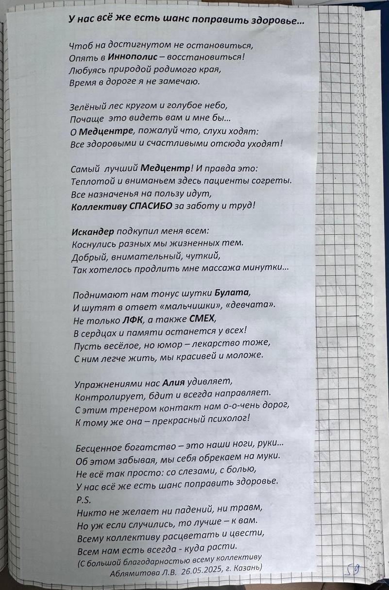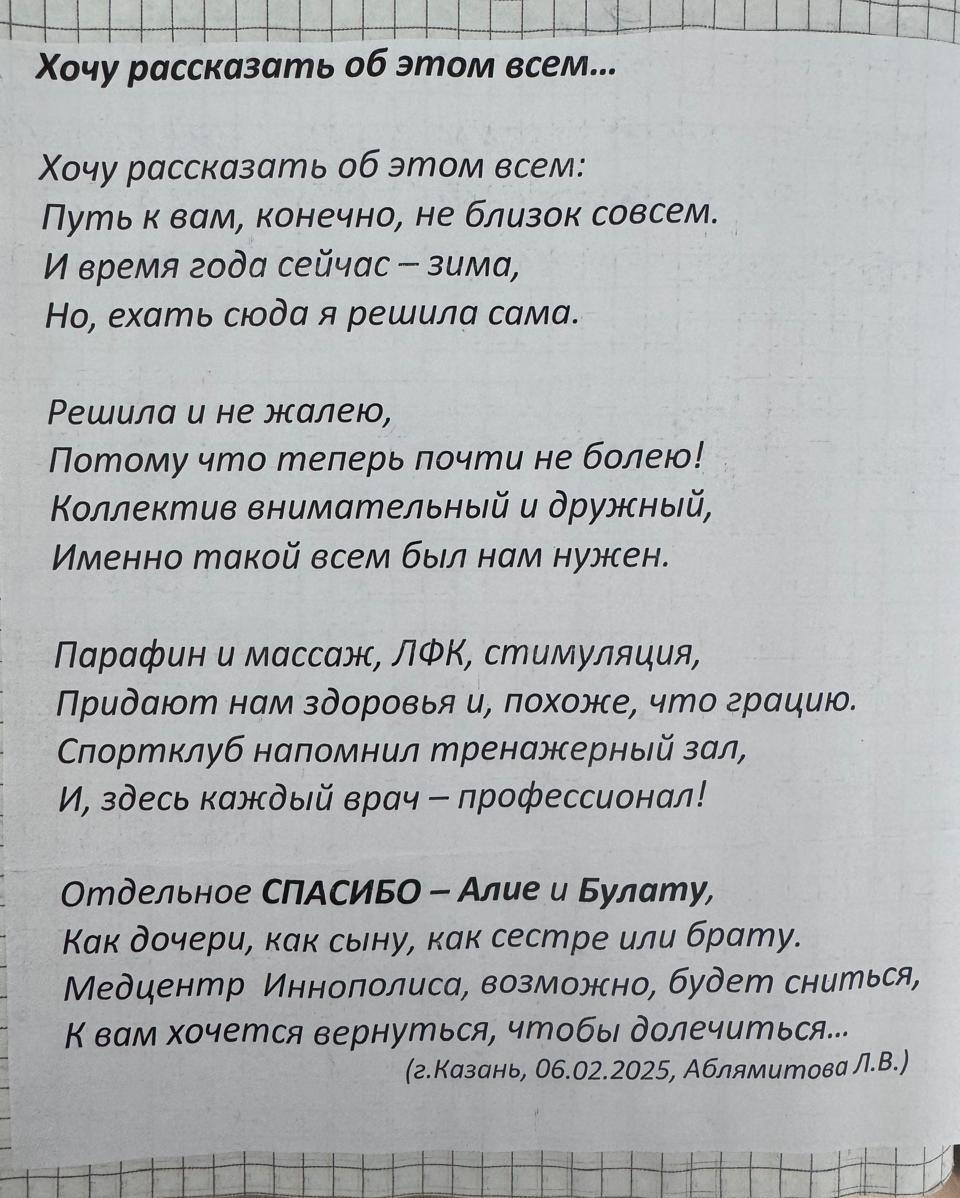 ? Вот такие красивые стихотворения пациентка посвящает отделению реабилитации Поликлиники №3 нашей больницы, которая работает в Иннополисе.