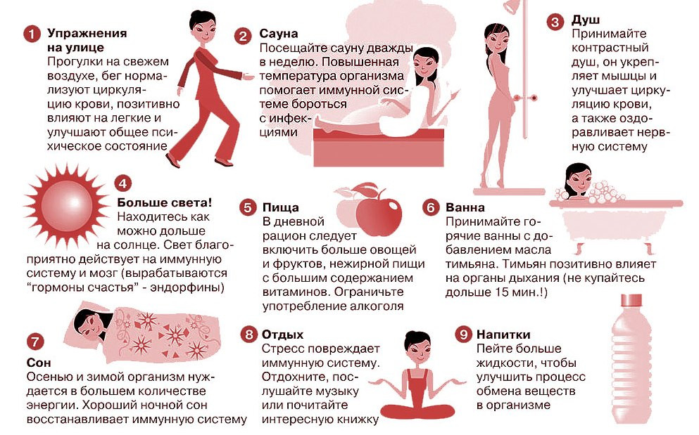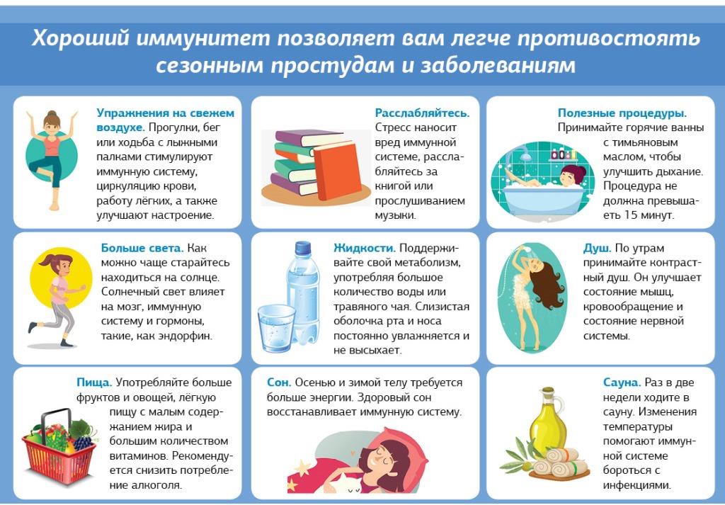 Регулярные занятия спортом, подвижный образ жизни. Доказано, что чрезмерные нагрузки могут негативно влиять на иммунитет.