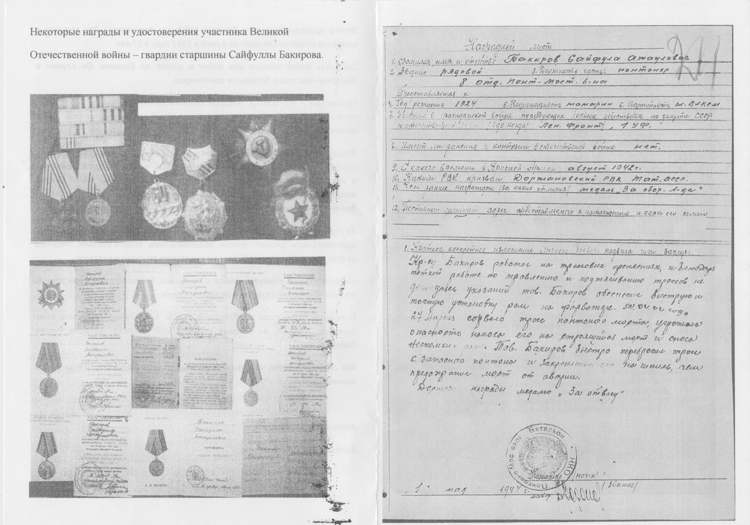 Сайфулла бабай прошел всю войну и дошел до Берлина. Он служил в понтонно-мостовом батальоне понтонером.