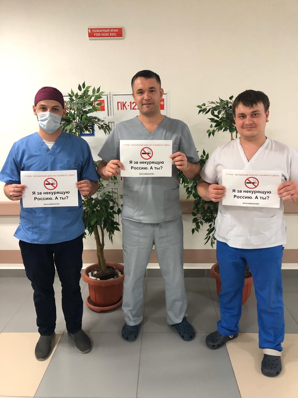 Врачи Городской клинической больницы №7 Казани присоединились к Всероссийской акции «Освободим Россию от табачного дыма!». Каждый, кто хочет поддержать Международный день отказа от табака, может самостоятельно распечатать надпись «Я за некурящую Россию. А ты?», сфотографироваться и выложить в социальные сети с хештегом #РОССИЯНЕКУРИТ.