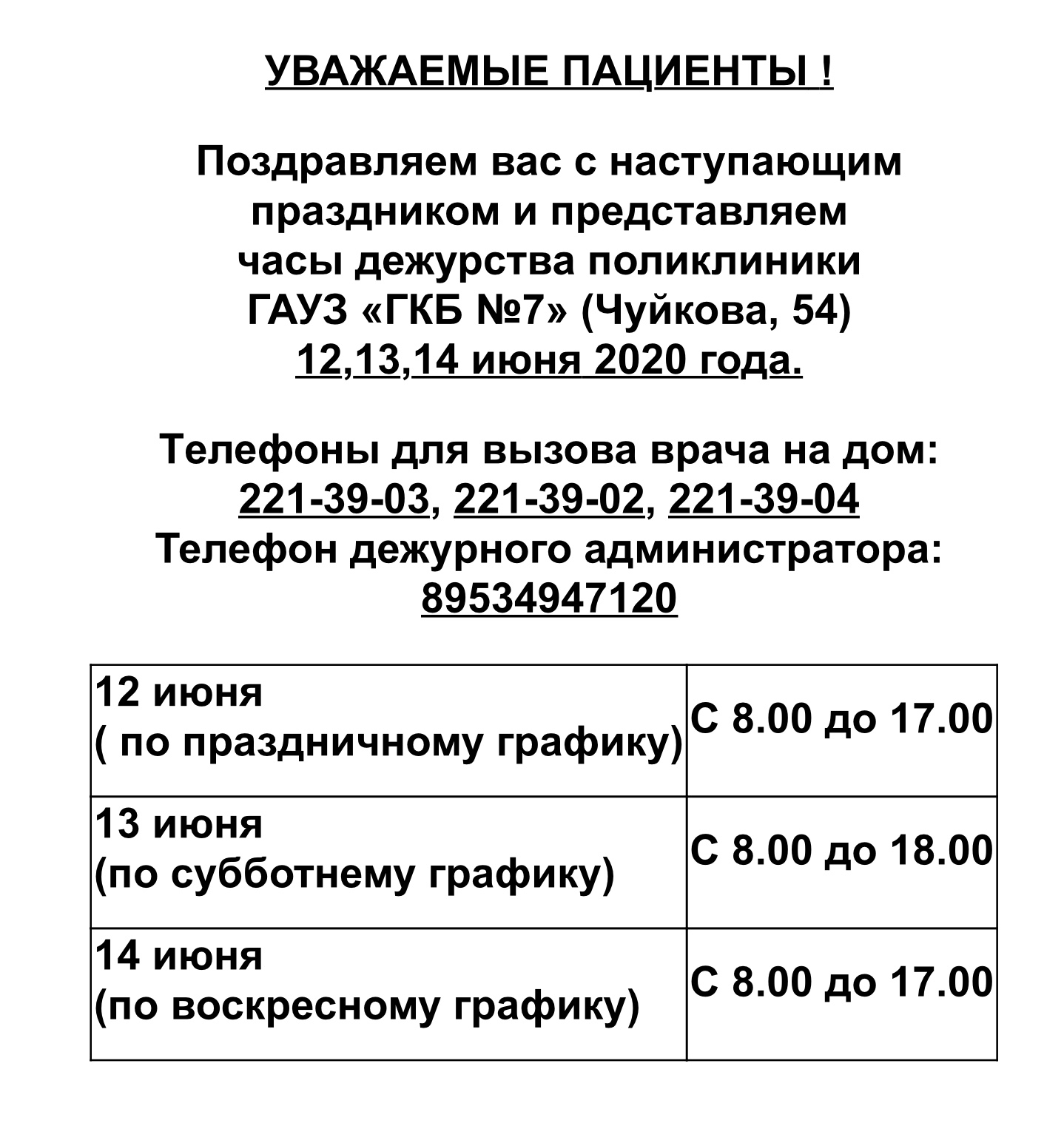 График работы поликлиники ГКБ 7 Казани 12 - 14 июня