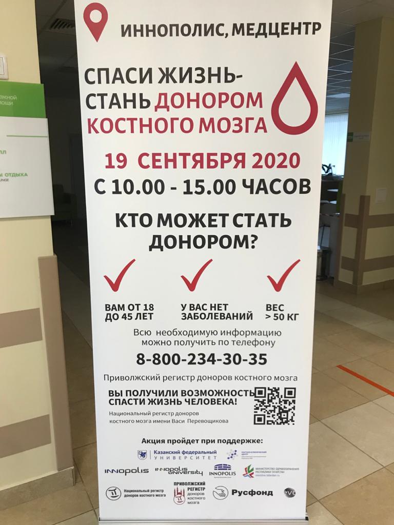 19 сентября с 10.00 до 15.00 в Медцентре Иннополиса каждый желающий сможет бесплатно сдать анализ на HLA-типирование с целью стать потенциальным донором костного мозга и спасти жизнь человека, страдающего от заболевания крови.