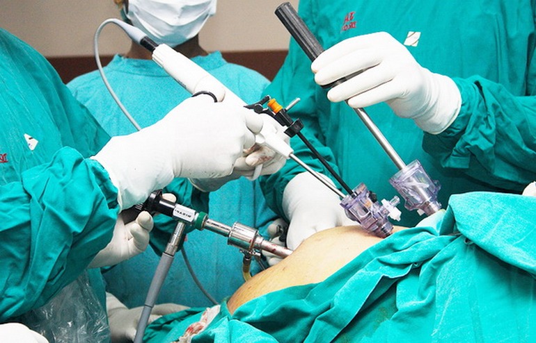 Проводится хирургическое вмешательство с использованием лапароскопа и специальных хирургических инструментов, которые вводятся через маленькие отверстия, сделанные в брюшной стенке.