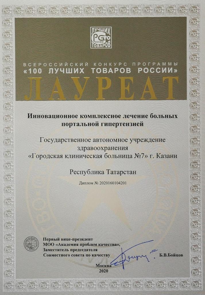 По итогам республиканского конкурса «Лучшие товары и услуги РТ» и всероссийского конкурса «100 лучших товаров России» Городская клиническая больница № 7 Казани стала лауреатом за «Инновационное комплексное лечение больных портальной гипертензией».