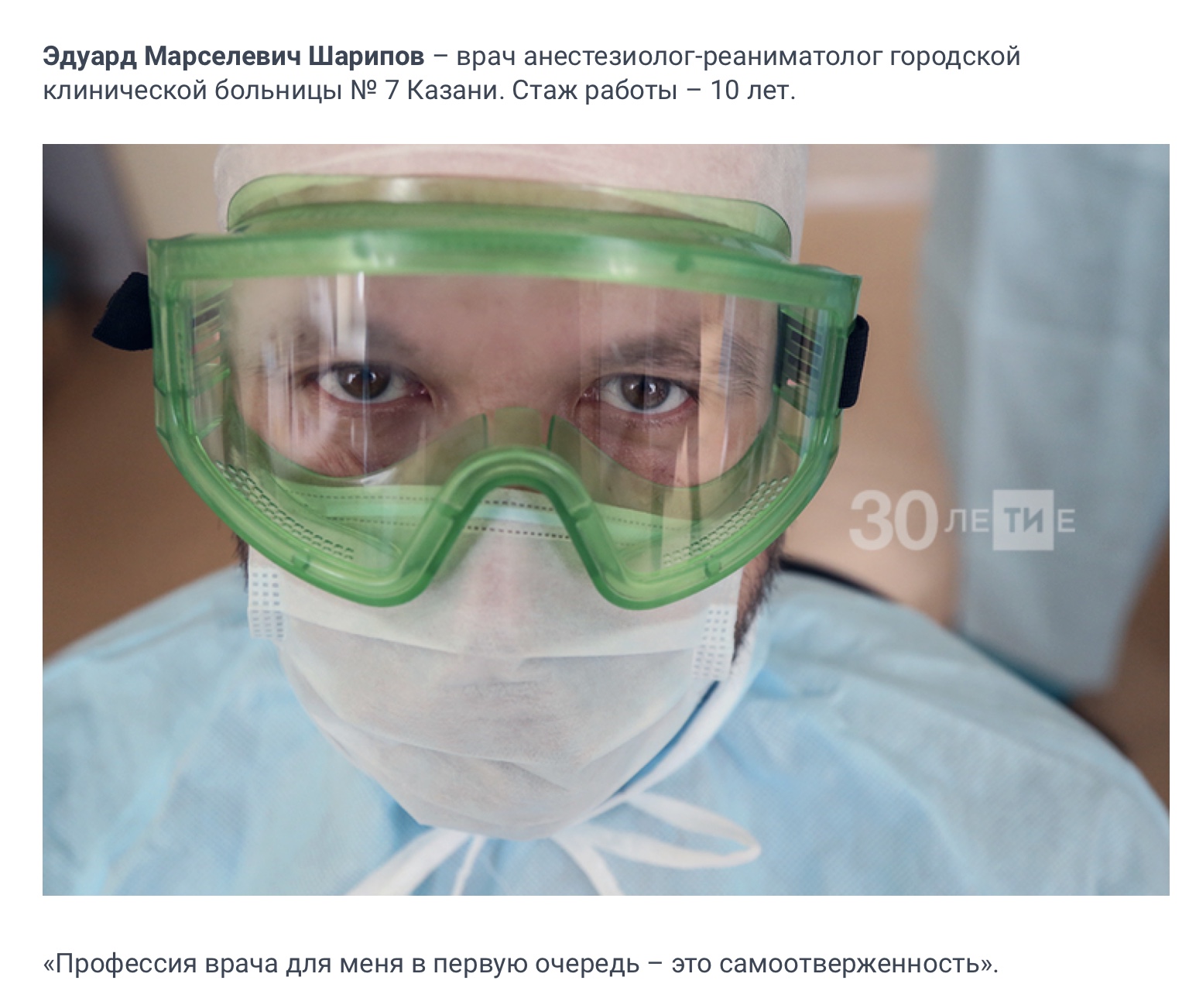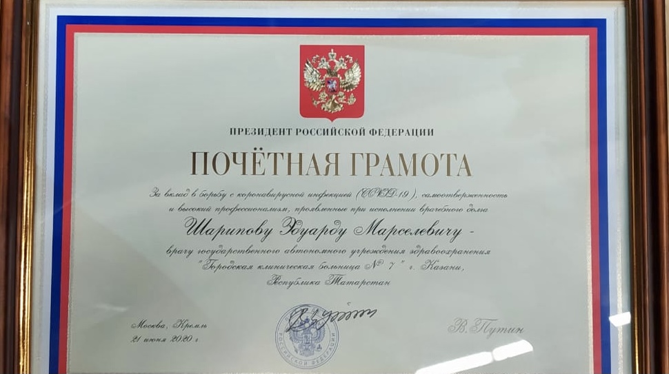 За вклад в борьбу с коронавирусной инфекцией (COVID-19) , самоотверженность и высокий профессионализм, проявленные при исполнении врачебного долга врачу анестезиологу - реаниматологу Городской клинической больницы N7 Казани Эдуарду Марселевичу Шарипову вручена Почетная Грамота Президента Российской Федерации.