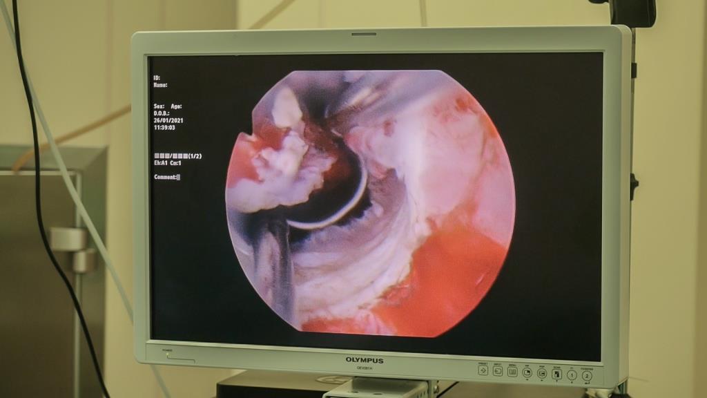 На мониторе мы видим, как склерозированные ткани полностью удаляются плазменной петлей, что позволяет устранить обструкцию.
