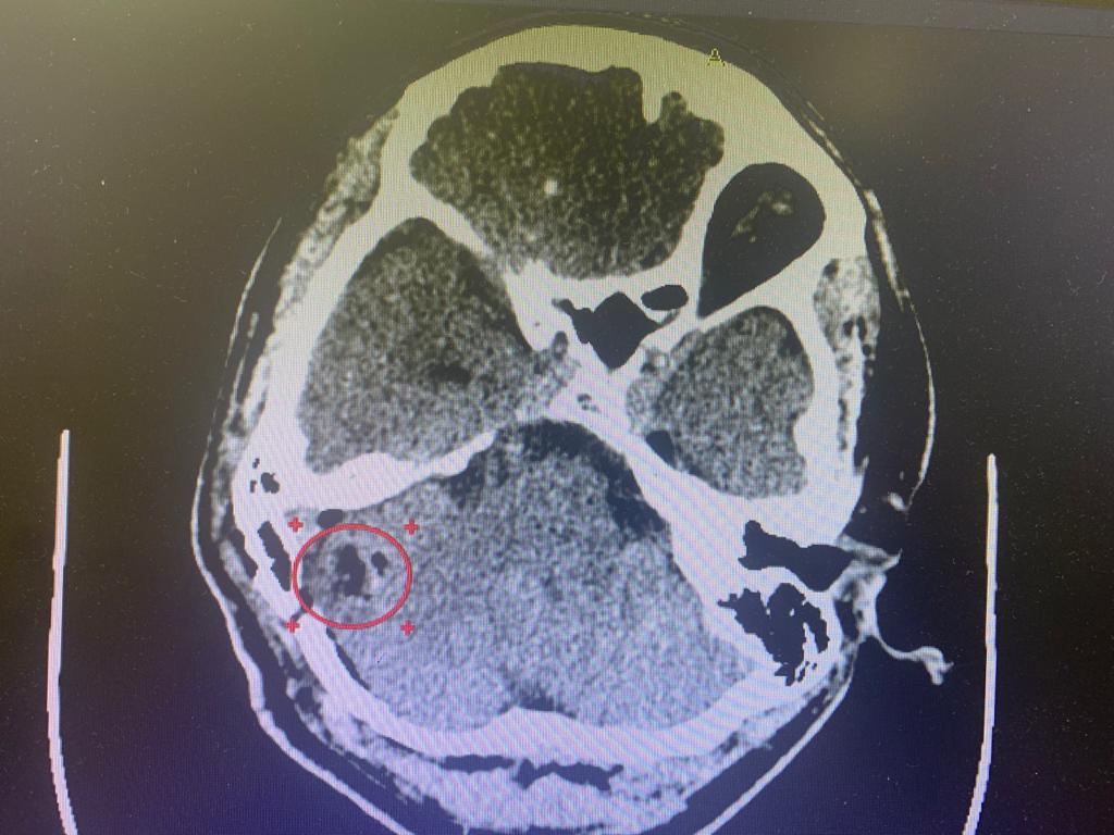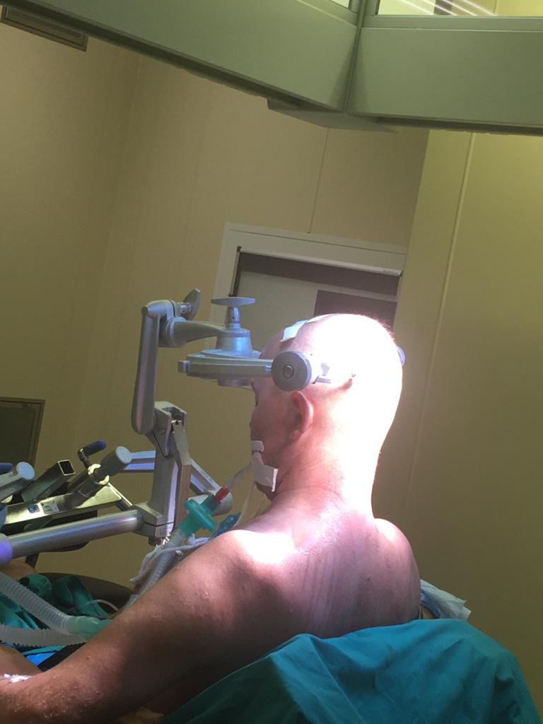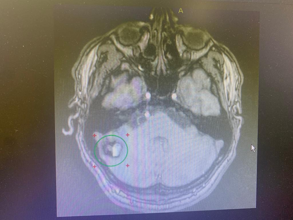 Были назначено полное обследование пациента. На МРТ головного мозга выявлена кавернома правого полушария мозжечка, имелись признаки перенесённого кровоизлияния. Учитывая хирургическую доступность к каверноме, нейрохирурги клиники выполнили операцию, пациент при этом находился в положении сидя.