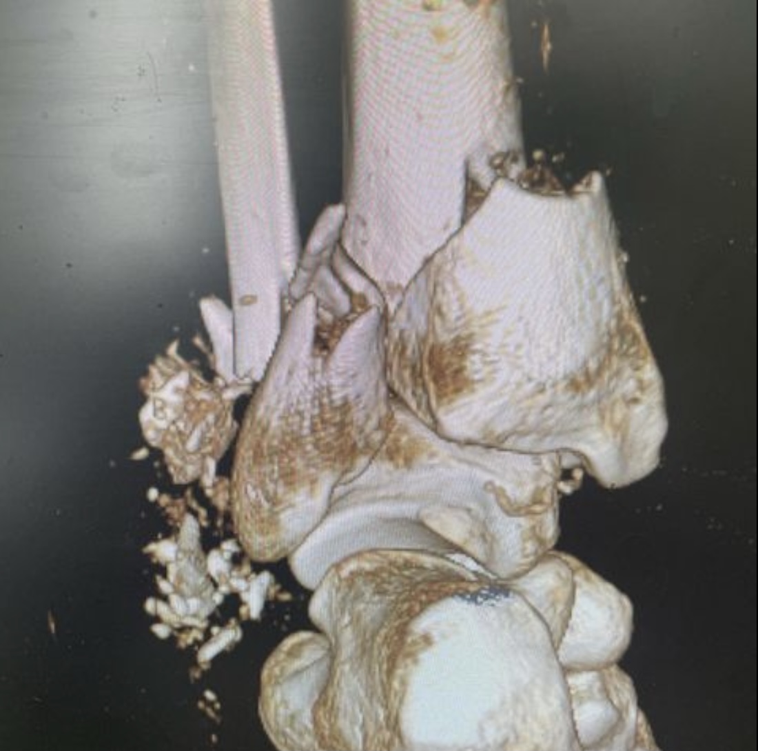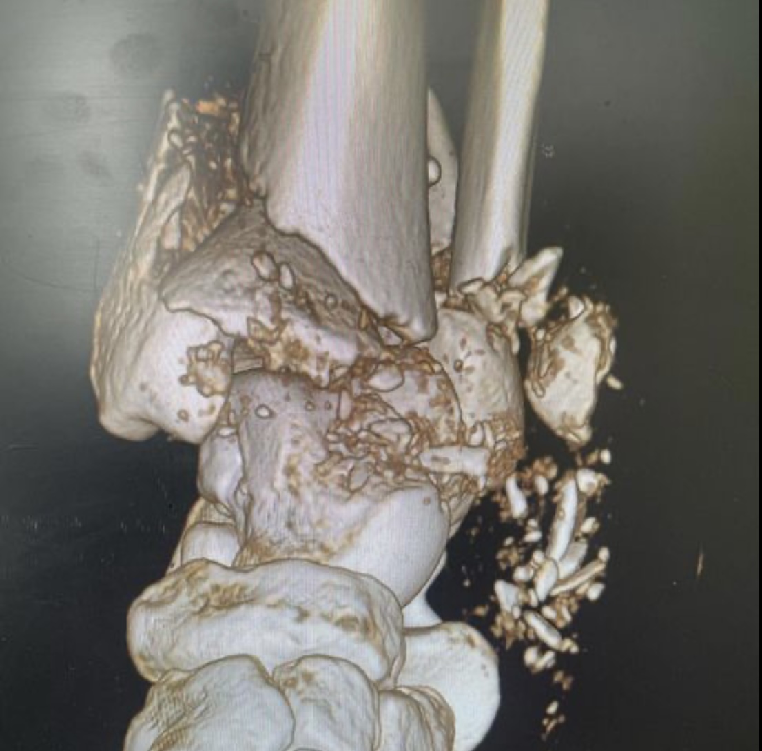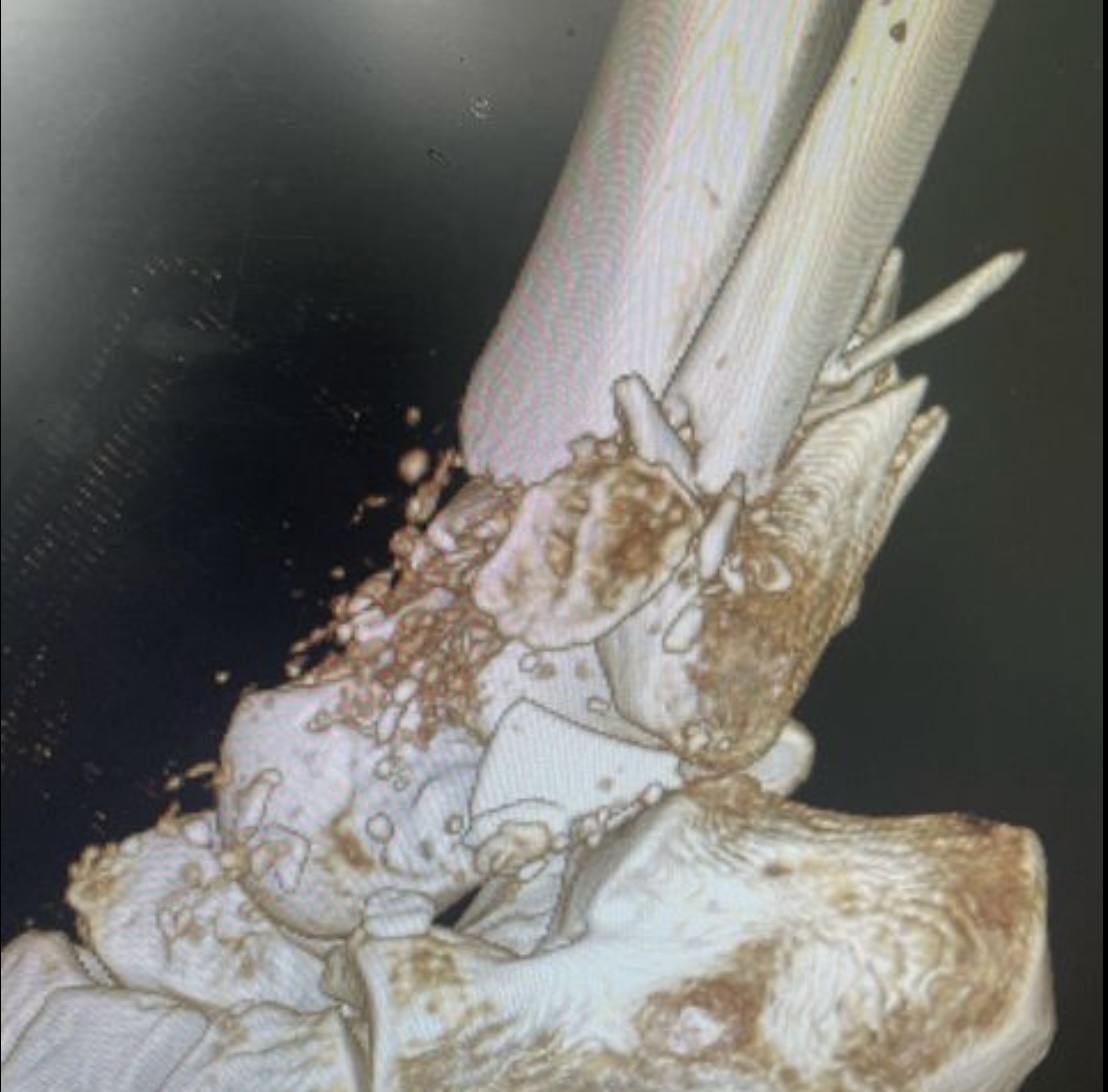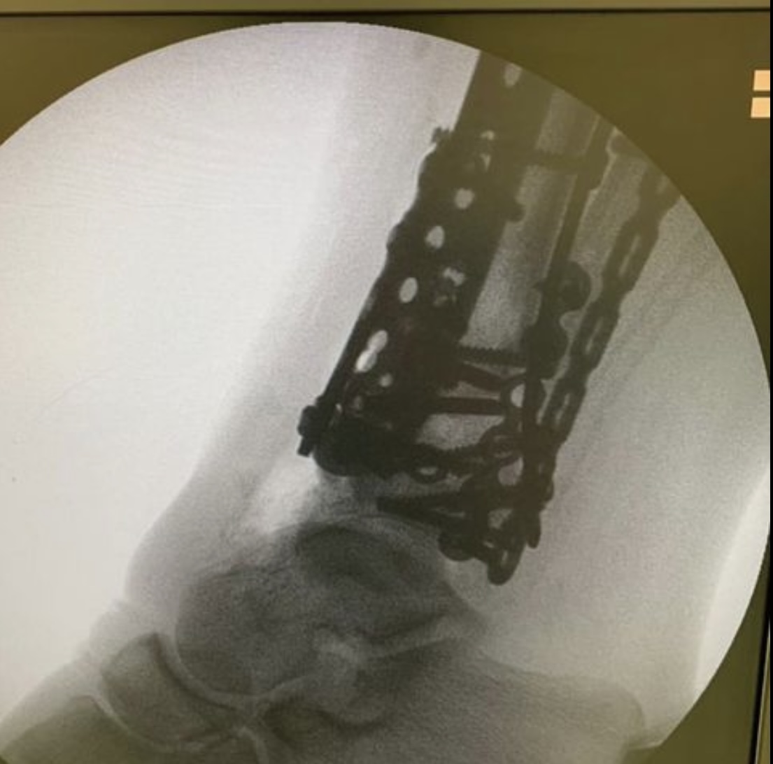 Травма в результате падения с нескольких ступенек разрушила дистальный суставной конец костей голени. Из-за алкогольного опьянения пациент продолжил ходить на своих ногах, образовался дефект кости в области метафиза. Выполнена открытая репозиция и остеосинтез пластинами с замещением дефекта кости синтетическим костным трансплантатом #ChronOs Швейцария.