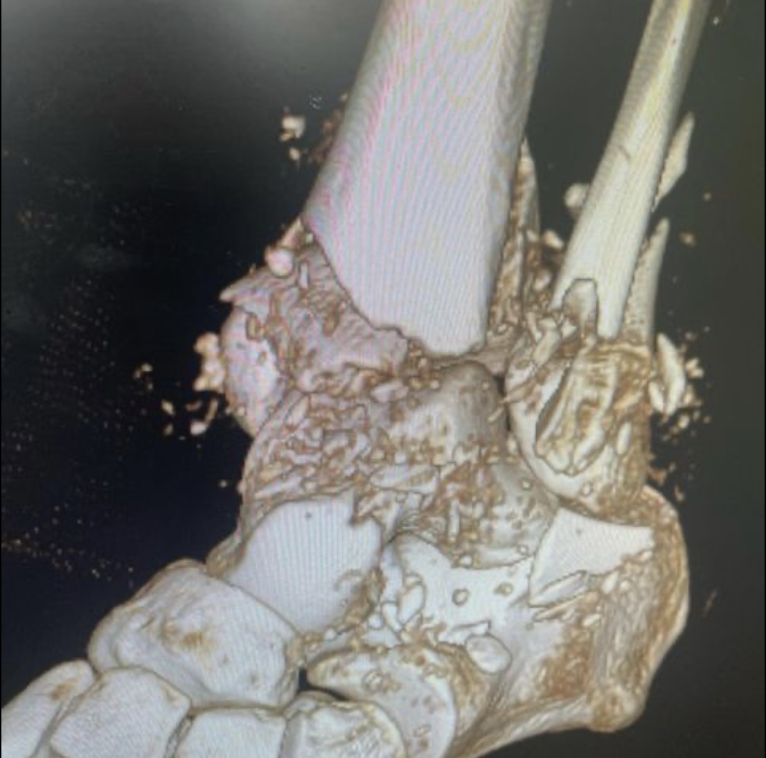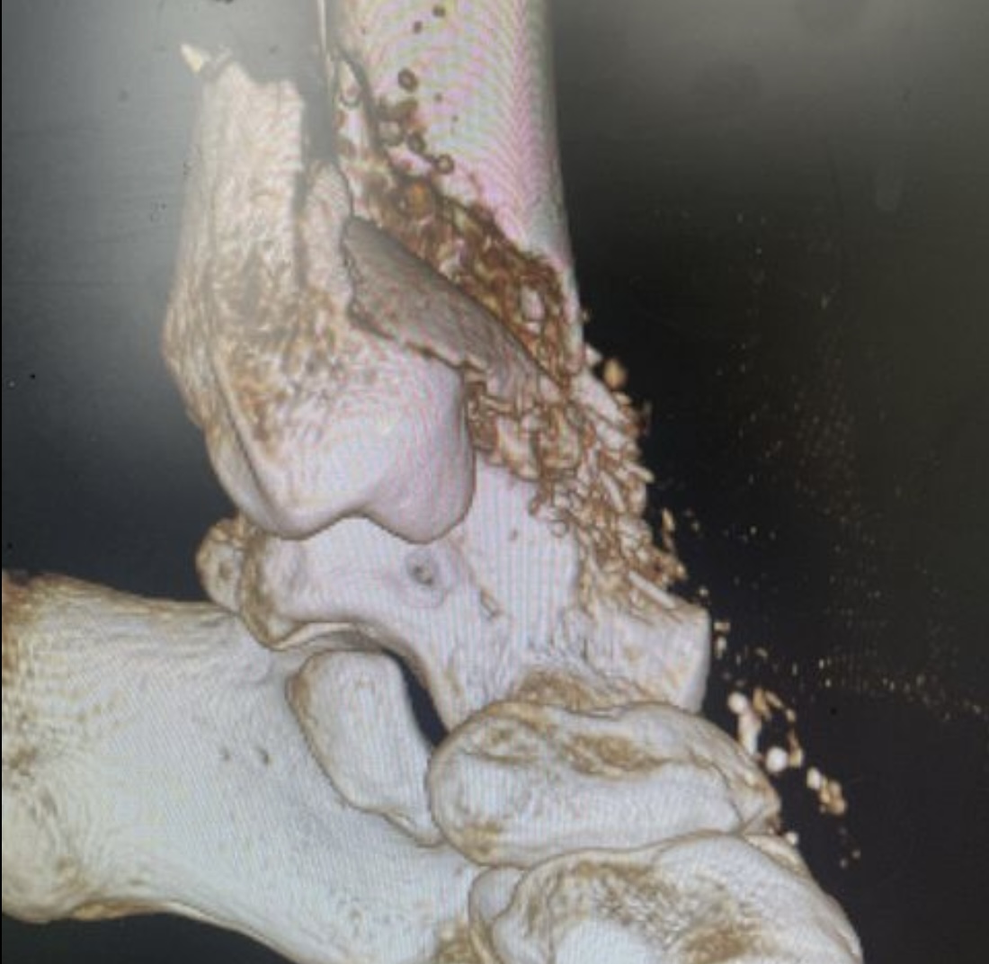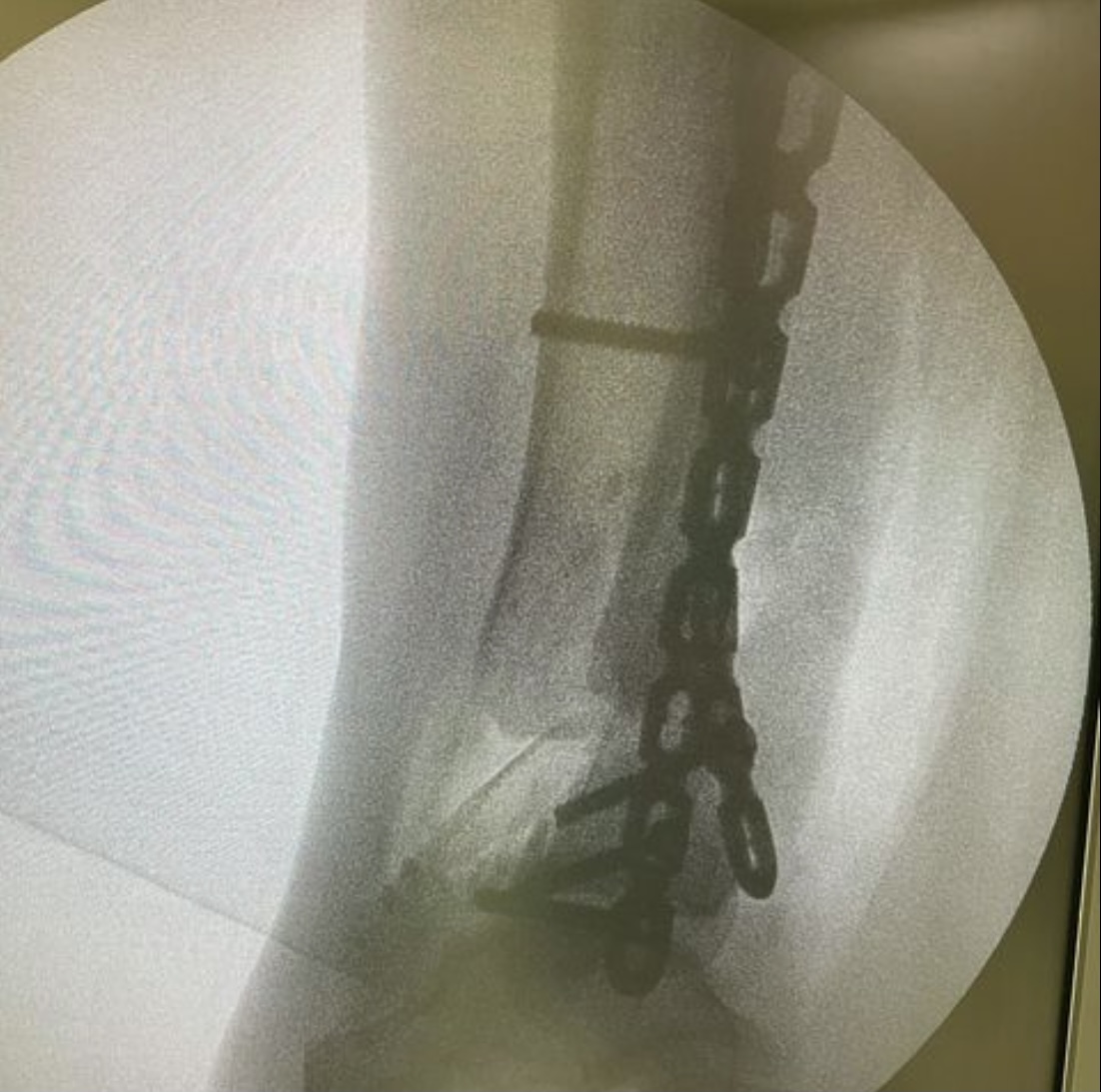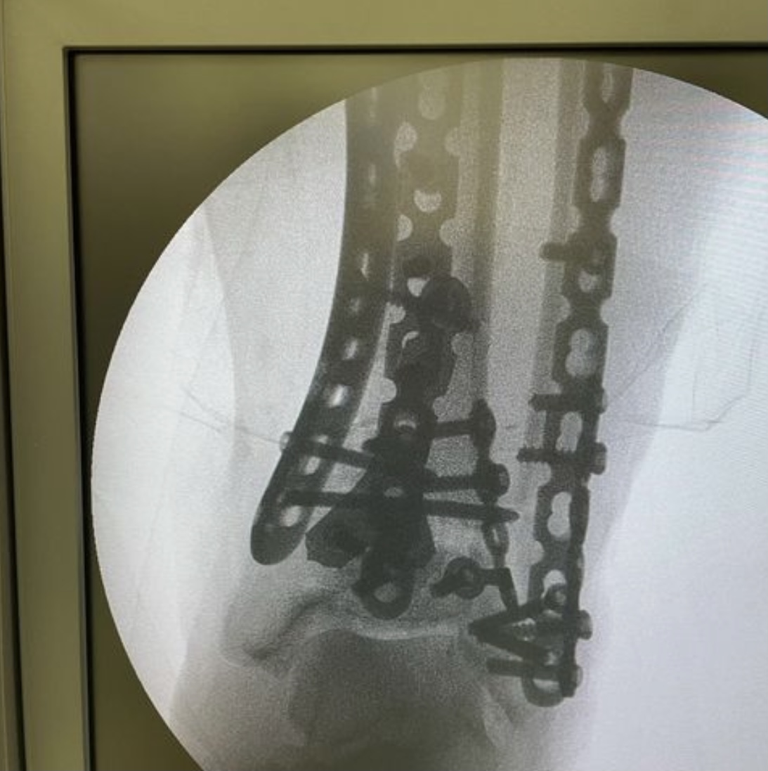 Травма в результате падения с нескольких ступенек разрушила дистальный суставной конец костей голени. Из-за алкогольного опьянения пациент продолжил ходить на своих ногах, образовался дефект кости в области метафиза. Выполнена открытая репозиция и остеосинтез пластинами с замещением дефекта кости синтетическим костным трансплантатом #ChronOs Швейцария.