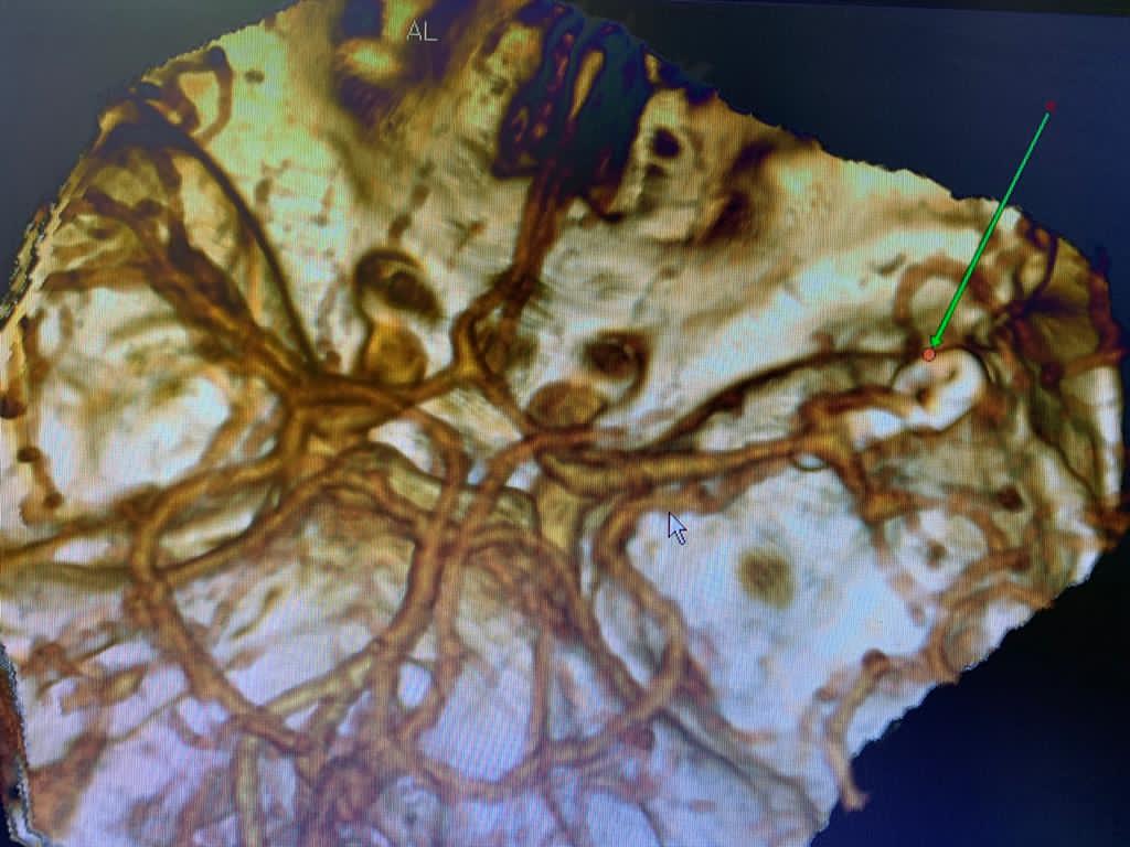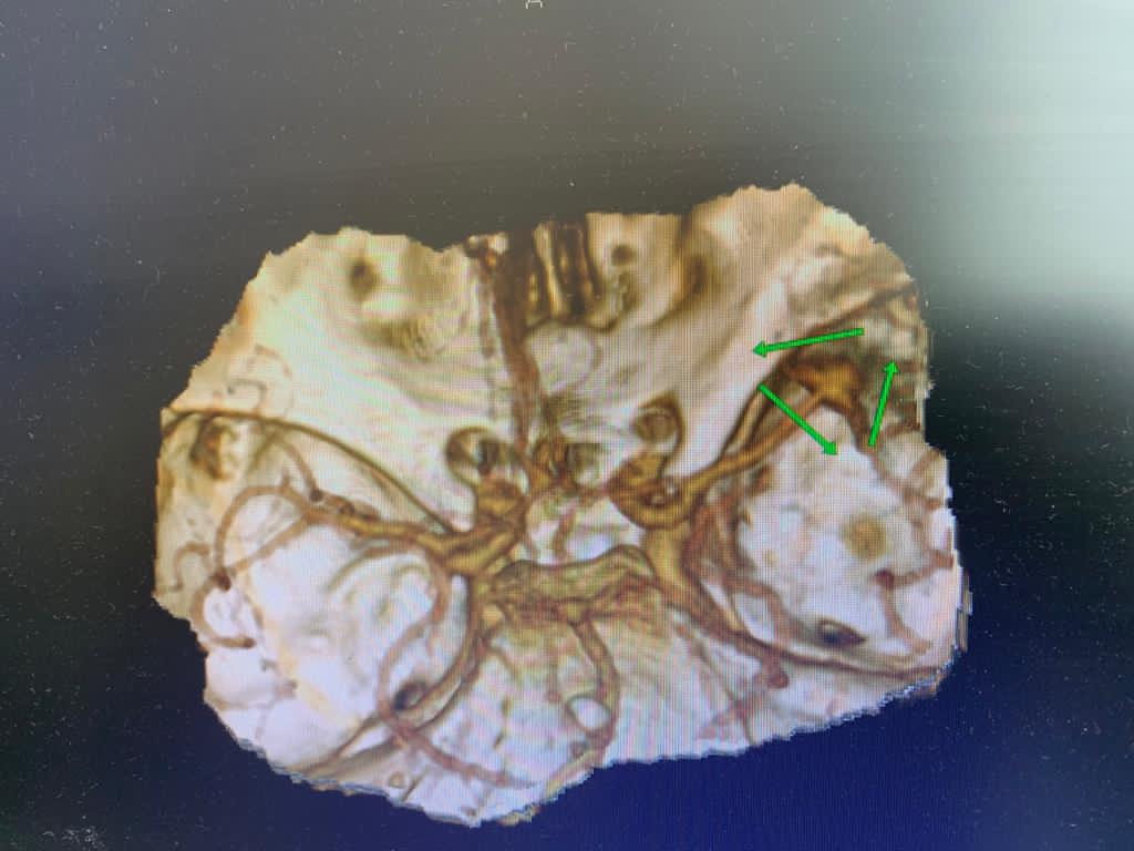 После проведённого обследования был поставлен диагноз: разорвавшаяся мешотчатая аневризма средней мозговой артерии. Опасностью при этом заболевании является высокий риск повторного кровоизлияния, что может привести к летальному исходу.