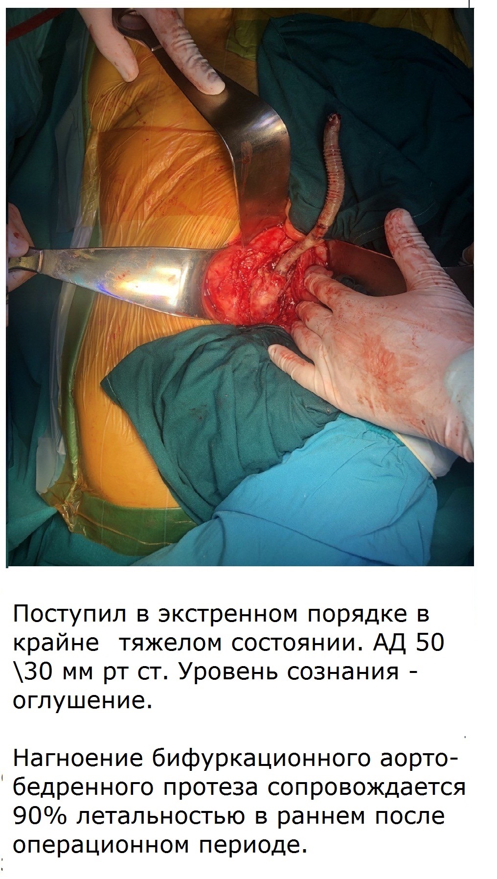 Как рассказал сосудистый хирург ГКБ 7 Казани Наиль Ринатович Закиржанов, шунтирующие операции на брюшном отделе аорты, при которых используется наложение аортального протеза в обход закрытого участка, технически очень сложны, и часто сопровождаются высоким риском интра- и послеоперационных осложнений. Самым серьезным осложнением, сопровождается высокой степенью летальности, является нагноение аортального протеза. Смерть наступает либо от развития фатального аррозивного кровотечения из расплавленной гноем сосудистой стенки, либо от протезного сепсиса. Частота инфицирования 2-6%. Нагноение является причиной ампутации одной или двух нижних конечностей в 50% случаев, летальность достигает 90%.
