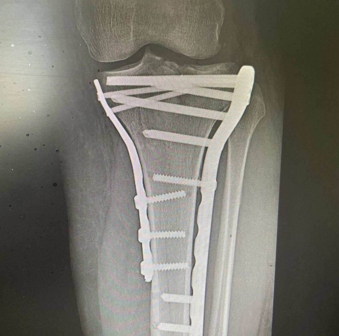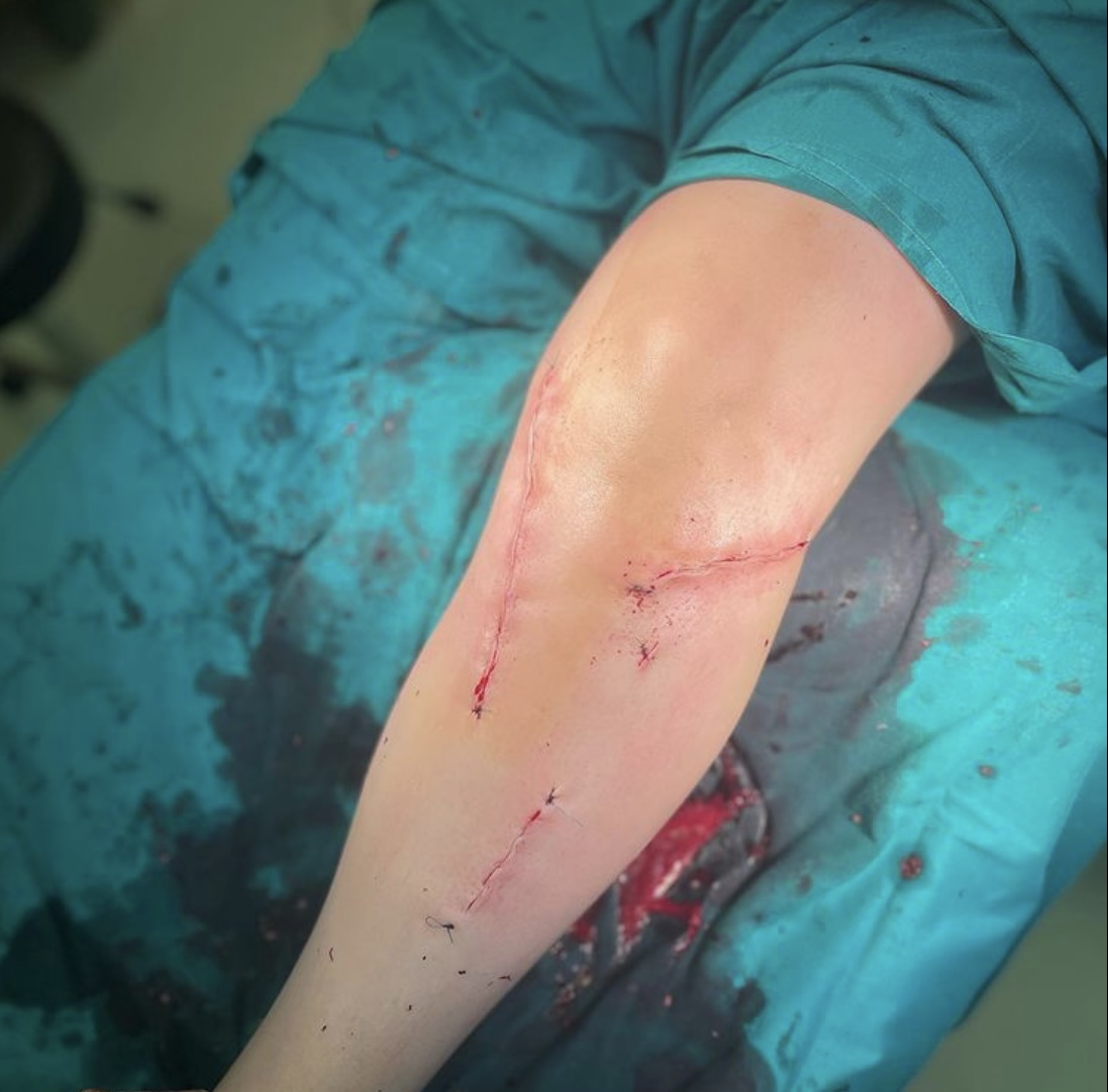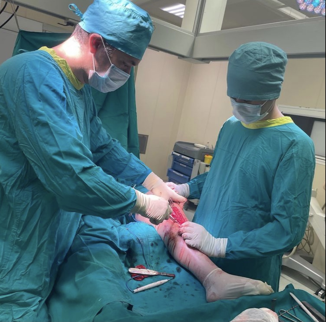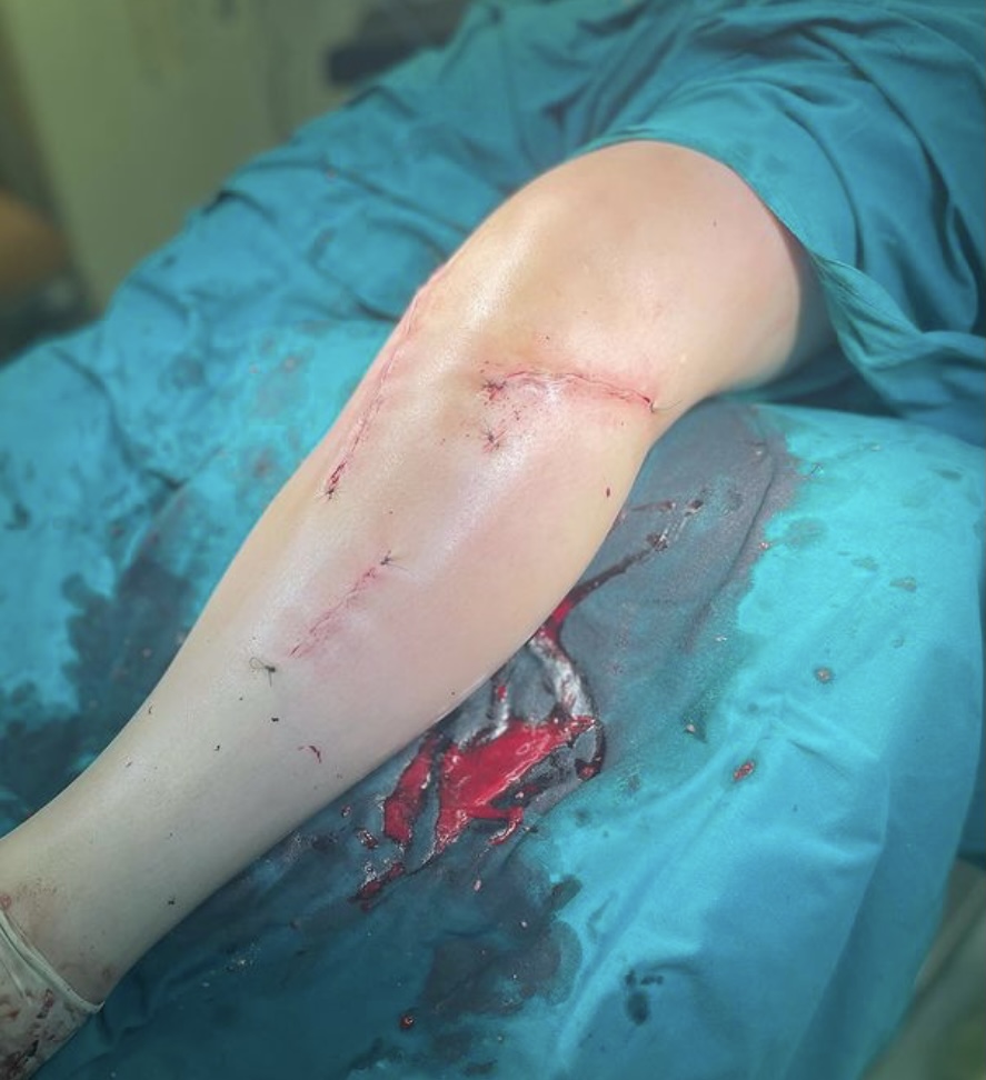 На операционном столе пациент с травмой в результате падения с самоката — многооскольчатый перелом верхнего суставного конца большеберцовой кости с разрывом боковых связок.