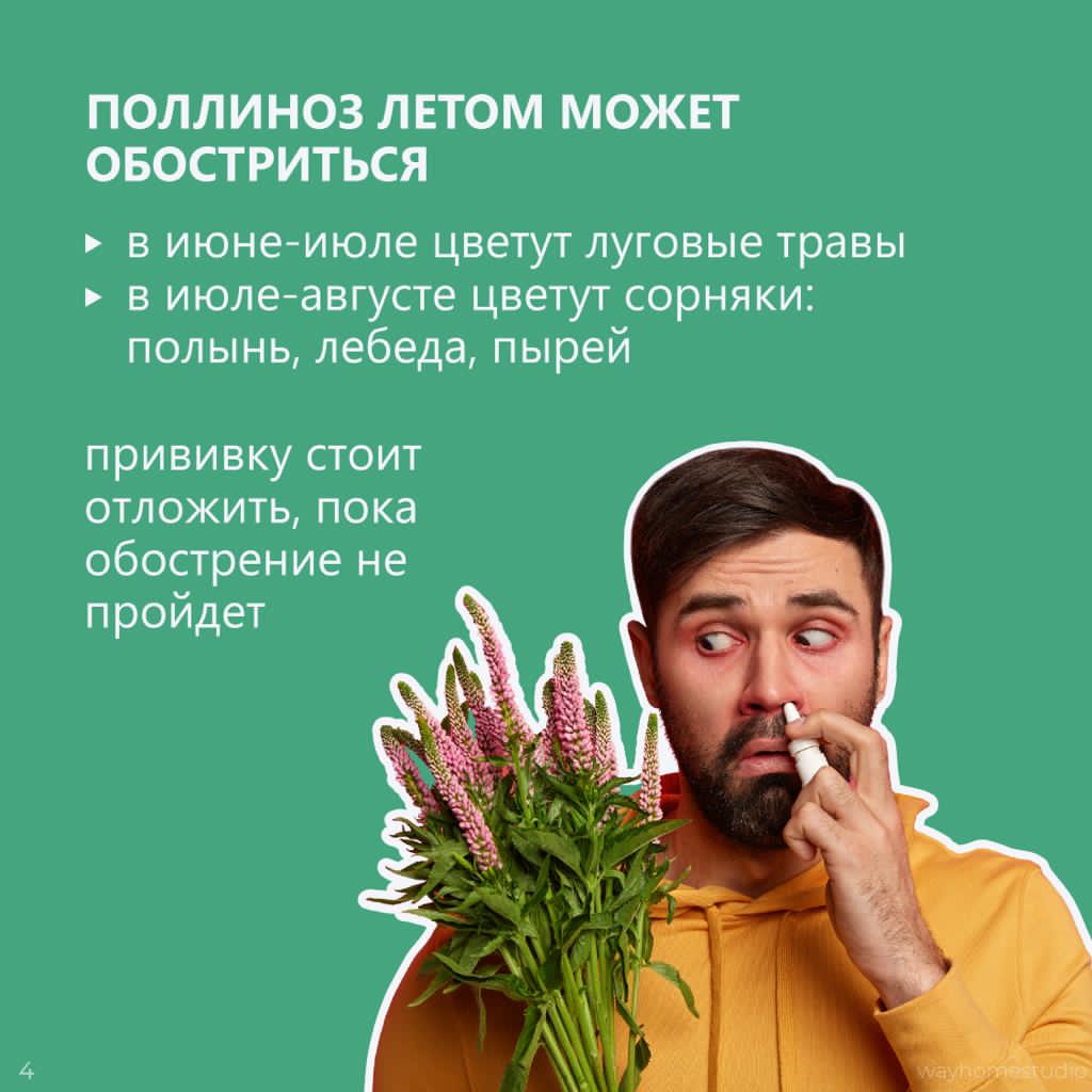 Людям с реакцией на укусы насекомых можно делать прививку в любое время, а вот пациентам с поллинозом рекомендуют вакцинироваться, только если нет обострения.