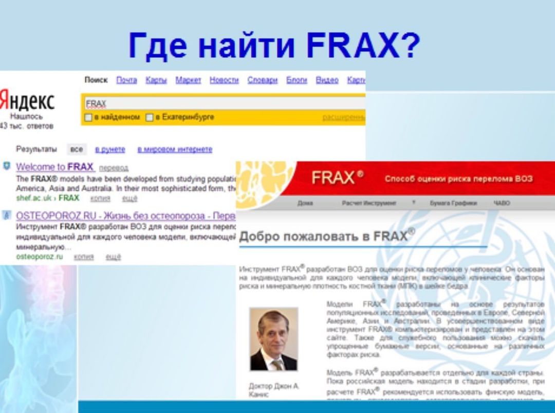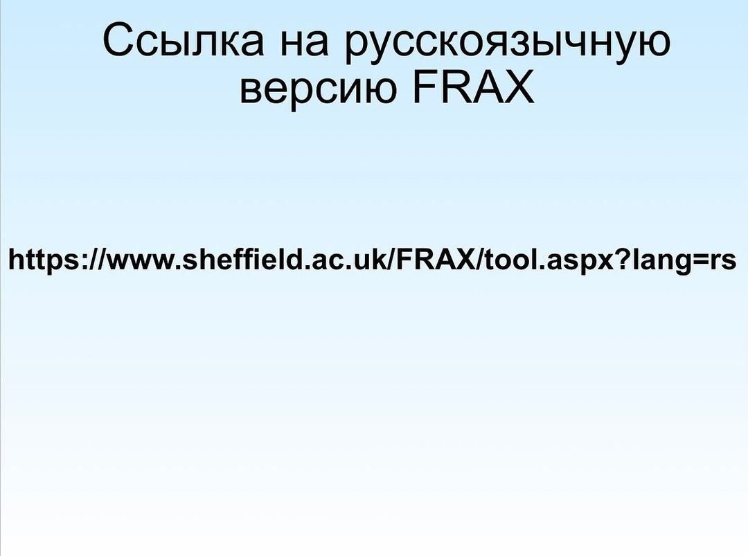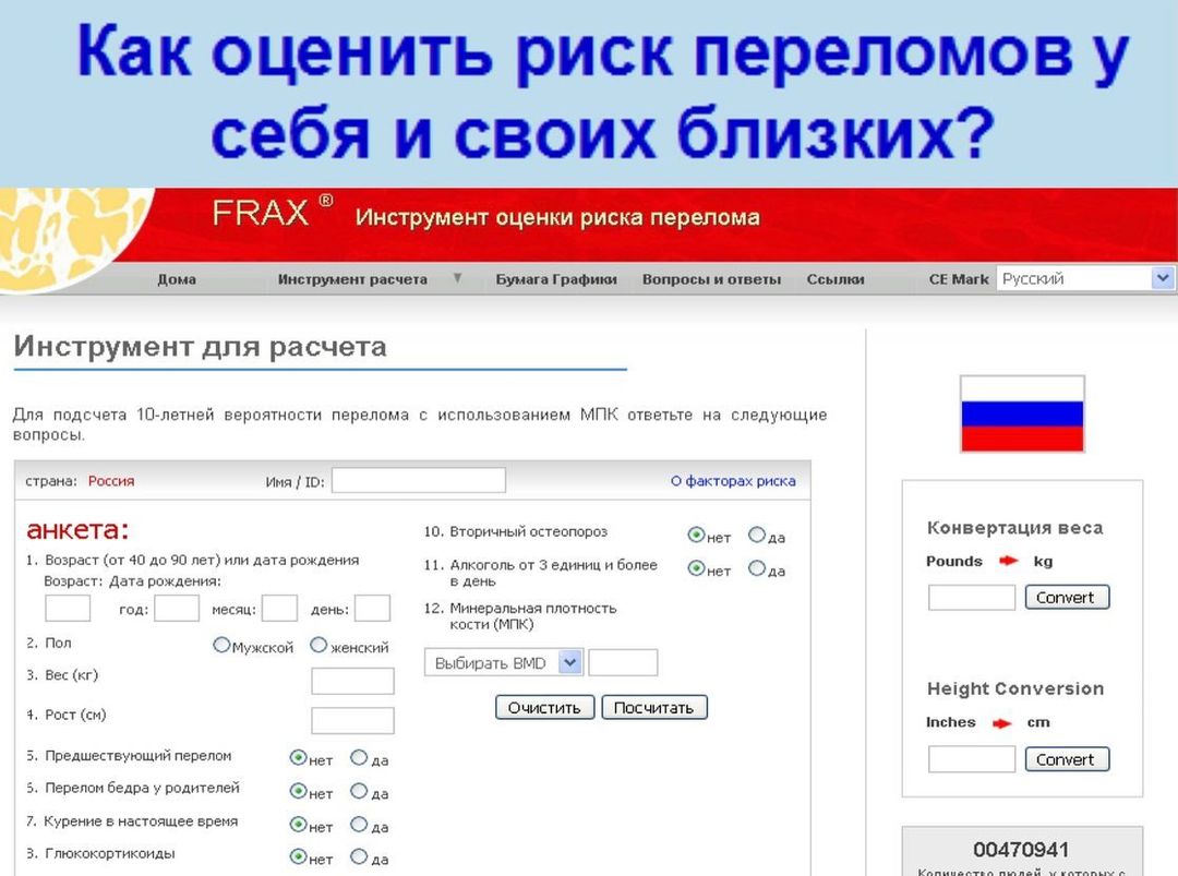 На основании данных этого исследования по калькулятору FRAX рассчитывается риск переломов в ближайшие 10 лет, и устанавливается состояние пациента: остеопения (по клиническим критериям заболевания как такового ещё нет, но имеется дефицит минеральной плотности), либо уже состоявшийся остеопороз.