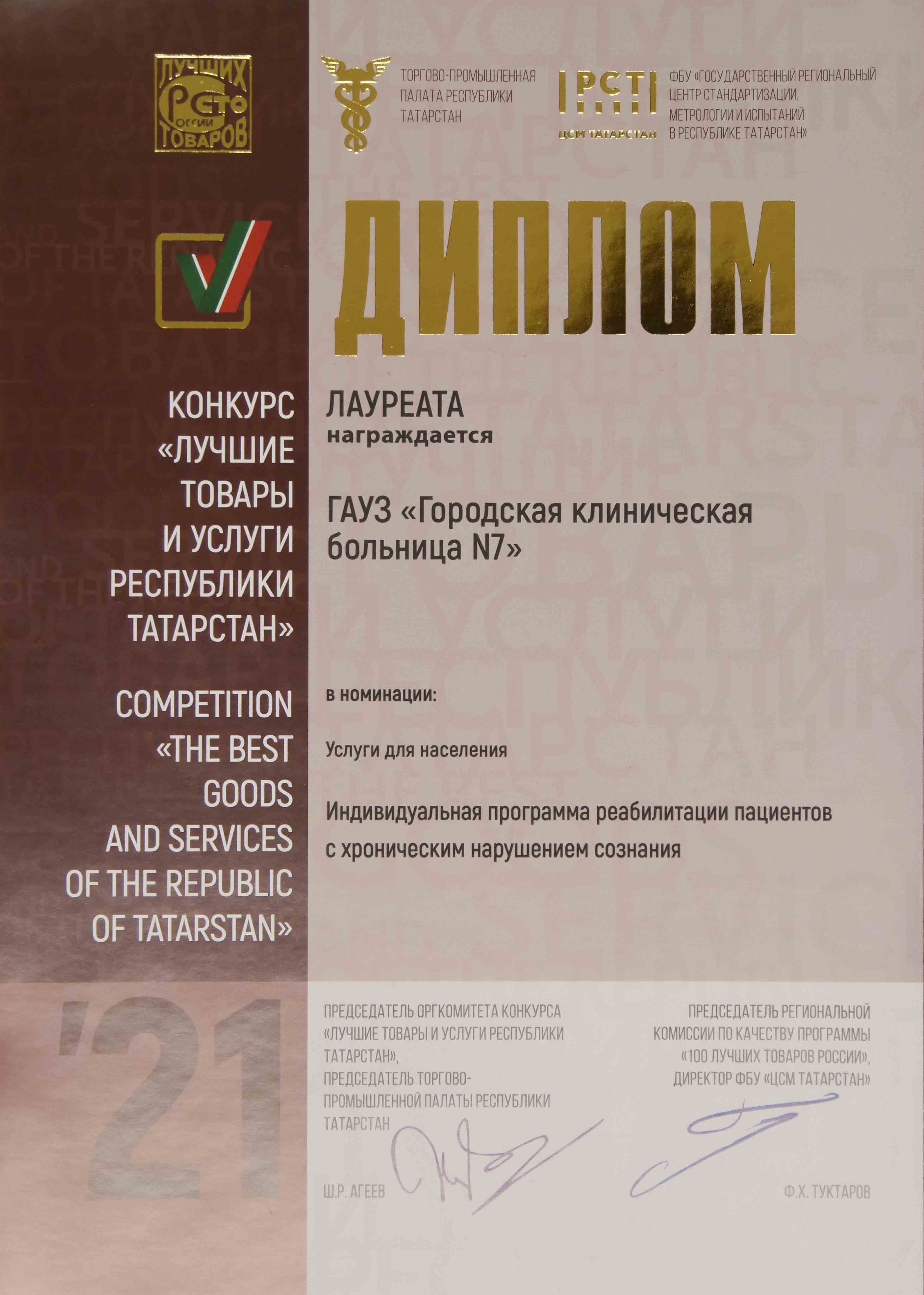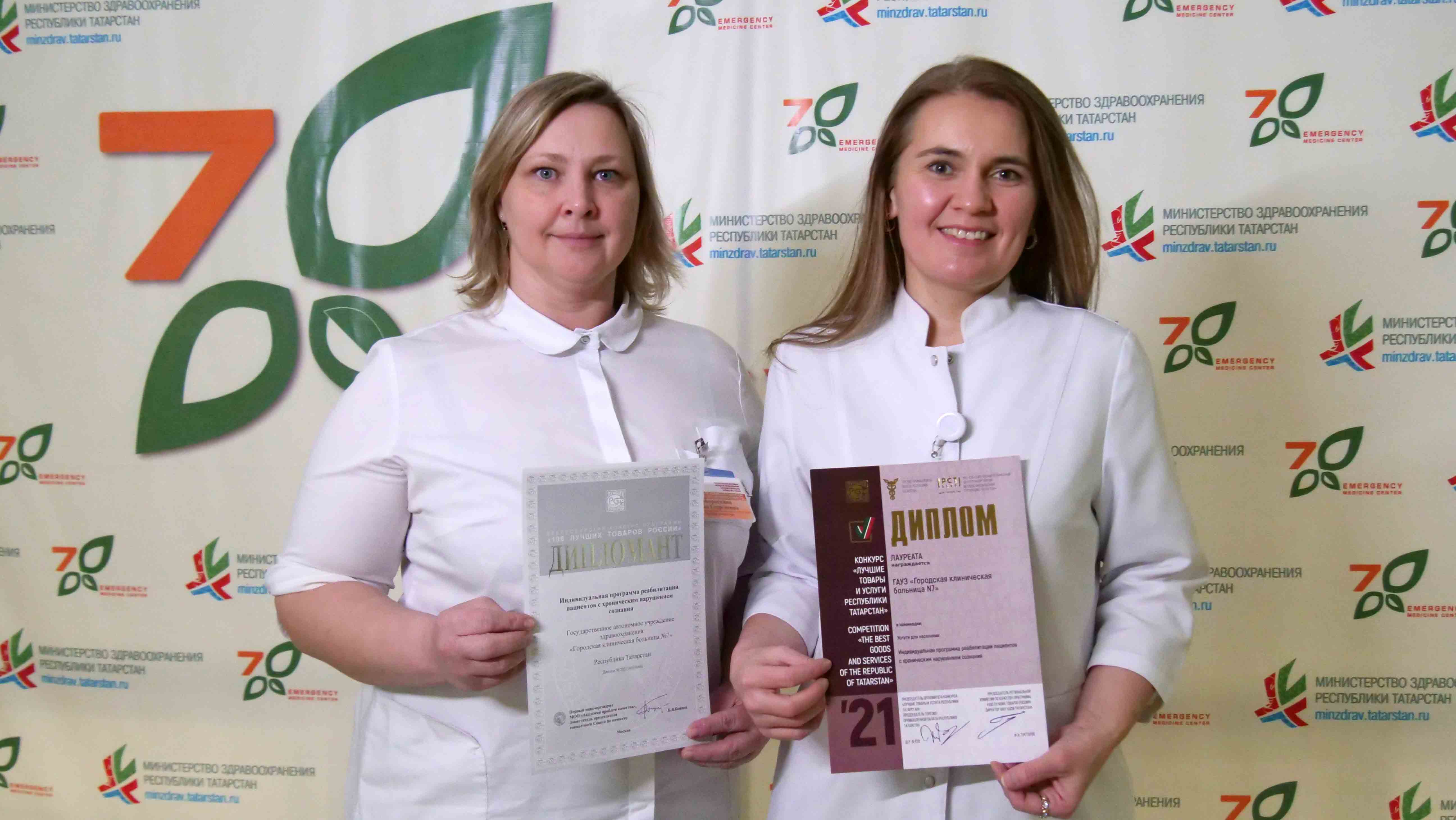 По итогам республиканского конкурса «Лучшие товары и услуги РТ» и Всероссийского конкурса «100 лучших товаров России» Городская клиническая больница № 7 Казани стала лауреатом за «Индивидуальную программу реабилитации пациентов с хроническим нарушением сознания».