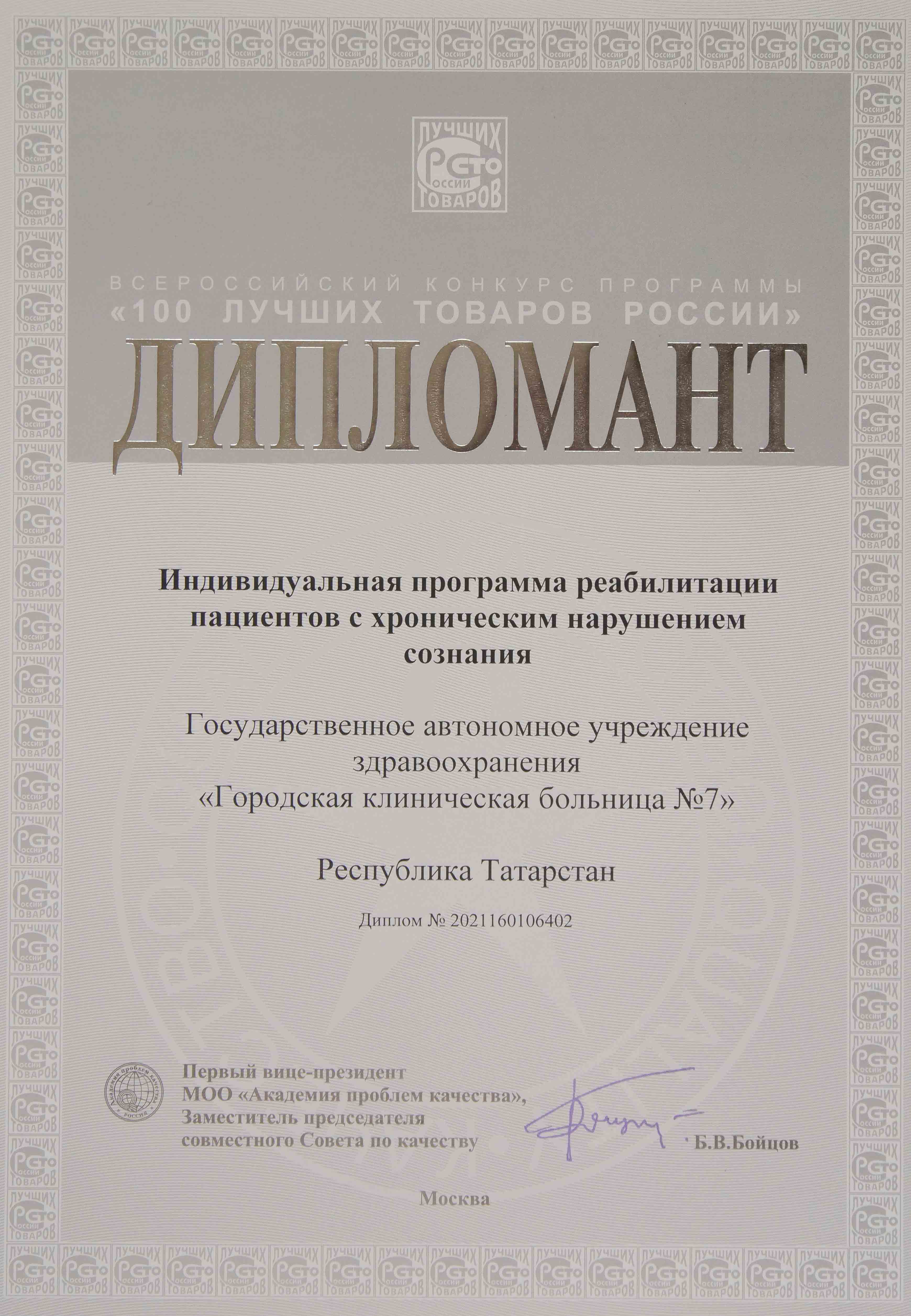 ГКБ 7 Казани лауреат и дипломант Всероссийского конкурса "100 лучших товаров России" за «Индивидуальную программу реабилитации пациентов с хроническим нарушением сознания»
